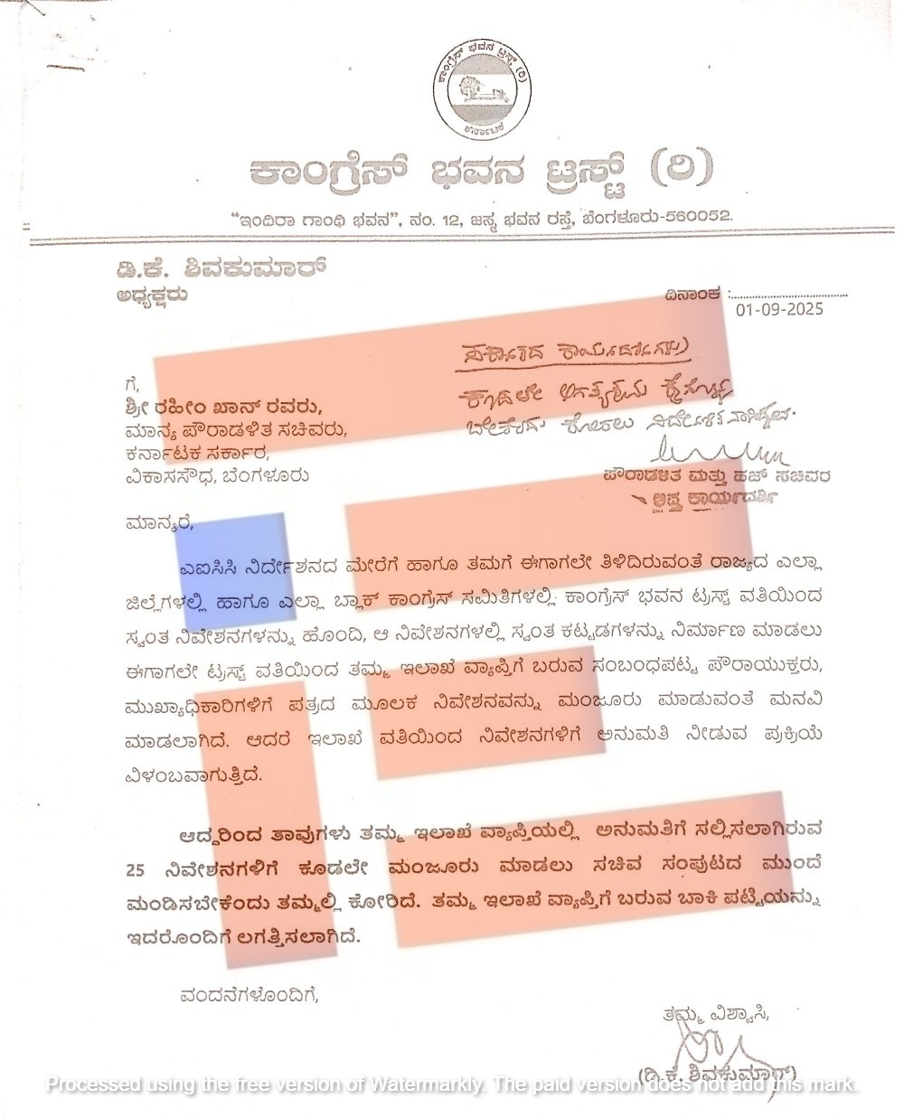 ಕಾಂಗ್ರೆಸ್ ಭವನ ಟ್ರಸ್ಟ್ನ ಅಧ್ಯಕ್ಷರೂ ಆಗಿರುವ ಉಪ ಮುಖ್ಯಮಂತ್ರಿ ಡಿ ಕೆ ಶಿವಕುಮಾರ್ ಅವರು ಟ್ರಸ್ಟ್ ಹೆಸರಿಗೆ ನಿವೇಶನಗಳನ್ನು ಮಂಜೂರು ಮಾಡಲು ಪೌರಾಡಳಿತ ಸಚಿವ ರಹೀಂ ಖಾನ್ ಅವರಿಗೆ 2025ರ ಸೆ.1ರಂದು ಪತ್ರ ಬರೆದಿದ್ದಾರೆ.