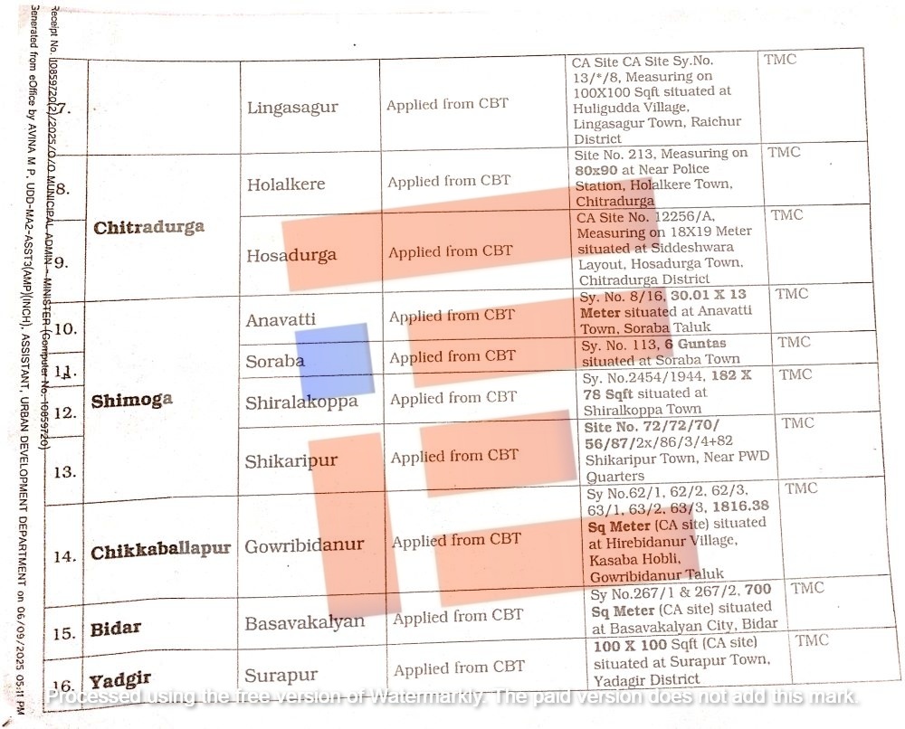 ಅದೇ ರೀತಿ ಚಿತ್ರದುರ್ಗದ ಹೊಳಲ್ಕೆರೆಯಲ್ಲಿ 80/90 ಅಳತೆ ನಿವೇಶನ, ಹೊಸದುರ್ಗದಲ್ಲಿ ಸಿ ಎ ನಿವೇಶನ (12256/ಎ, 18/19 ಮೀಟರ್, ಶಿವಮೊಗ್ಗ ಜಿಲ್ಲೆಯ ಆನವಟ್ಟಿಯಲ್ಲಿ ಸರ್ವೇ ನಂಬರ್ 8/16ರಲ್ಲಿ 30.01/13 ಮೀಟರ್, ಸೊರಬದಲ್ಲಿ ಸರ್ವೆ ನಂಬರ್ 113 ರಲ್ಲಿ 6 ಗುಂಟೆ, ಶಿರಾಳಕೊಪ್ಪದಲ್ಲಿ ಸರ್ವೆ ನಂಬರ್ 2454/1944 ರಲ್ಲಿ 182/78 ಸ್ಕೈಯರ್ ಫಿಟ್, ಚಿಕ್ಕಬಳ್ಳಾಪುರದಲ್ಲಿ ಗೌರಿಬಿದನೂರಿನಲ್ಲಿ ಸರ್ವೆ ನಂಬರ್ 62/1, 62/2, 62/3, 63/1, 63/2, 63/3ನಲ್ಲಿ 1816.38 ಸ್ಕೈಯರ್ ಮೀಟರ್, ಬೀದರ್ನ ಬಸವಕಲ್ಯಾಣದಲ್ಲಿ ಸರ್ವೆ ನಂಬರ್ 267/1 267/2 ರಲ್ಲಿ 700 ಸ್ಕೈಯರ್ ಮೀಟರ್, ಯಾದಗಿರಿಯ ಸುರಪುರದಲ್ಲಿನ 100/100 ಸ್ಕೈಯರ್ ಫೀಟ್ನ ಸಿ ಎ ನಿವೇಶನಕ್ಕೆ ಅರ್ಜಿ ಸಲ್ಲಿಸಿದೆ.