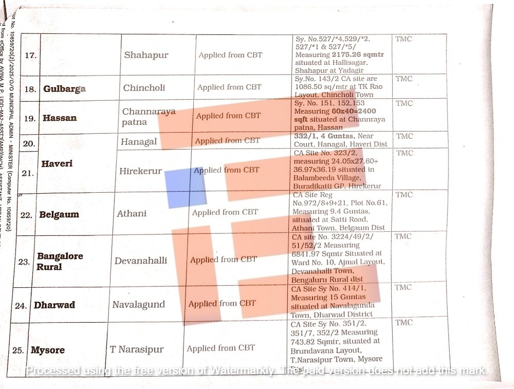 ಶಹಾಪುರದಲ್ಲಿ ಸರ್ವೇ ನಂಬರ್ 527/, 529/2, 527/1, 527/5ರಲ್ಲಿನ 2175.26 ಸ್ಕೈಯರ್ ಮೀಟರ್, ಗುಲ್ಬರ್ಗಾದ ಚಿಂಚೋಳಿಯಲ್ಲಿ ಸರ್ವೆ ನಂಬರ್ 143/2 ರಲ್ಲಿನ ಸಿ ಎ ನಿವೇಶನ (1086.50 ಸ್ಕೈಯರ್ ಮೀಟರ್), ಹಾಸನದ ಚನ್ನರಾಯಪಟ್ಟಣದ ಸರ್ವೇ ನಂಬರ್ 151, 152, 153ರಲ್ಲಿನ 60/40 ಅಳತೆಯ 2,400 ಸ್ಕೈಯರ್ ಫೀಟ್, ಹಾವೇರಿಯ ಹಿರೇಕೆರೂರಿನಲ್ಲಿ ಸಿ ಎ ನಿವೇಶನ (ಸಂಖ್ಯೆ 323/2ರಲ್ಲಿನ 24.05/05/27/60/36.97.36.19) ,