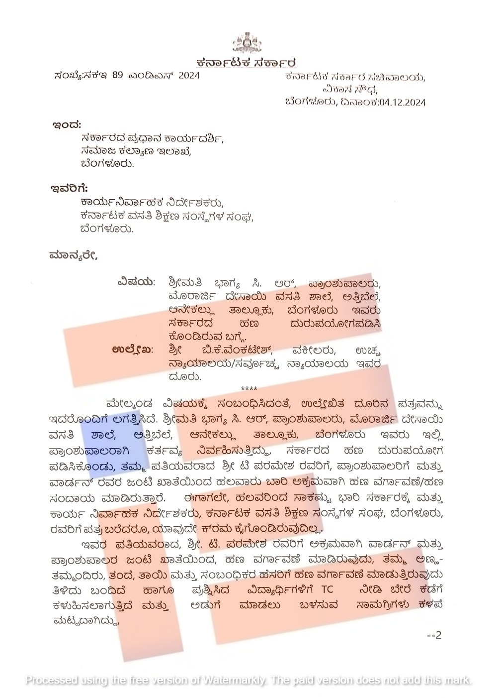 ಆನೇಕಲ್ ತಾಲೂಕು ಅತ್ತಿಬೆಲೆಯಲ್ಲಿರುವ ಮೊರಾರ್ಜಿ ದೇಸಾಯಿ ವಸತಿ ಶಾಲೆಯ ಪ್ರಾಂಶುಪಾಲರಾದ ಭಾಗ್ಯ ಸಿ ಆರ್ ಎಂಬುವರು ಸರ್ಕಾರದ ಹಣ ದುರುಪಯೋಗಪಡಿಸಿಕೊಳ್ಳುತ್ತಿದ್ದಾರೆ. ತಮ್ಮ ಪತಿ ಟಿ ಪರಮೇಶ್ ಅವರಿಗೆ ಪ್ರಾಂಶುಪಾಲರು ಮತ್ತು ವಾರ್ಡನ್ ಅವರ ಜಂಟಿ ಖಾತೆಯಿಂದ ಹಲವಾರು ಬಾರಿ ಅಕ್ರಮವಾಗಿ ಹಣ ವರ್ಗಾವಣೆ ಆಗಿದೆ. ಈಗಾಗಲೇ ಹಲವರಿಂದ ಸಾಕಷ್ಟು ಬಾರಿ ಸರ್ಕಾರಕ್ಕೆ ಮತ್ತು ಕ್ರೈಸ್ನ ಕಾರ್ಯನಿರ್ವಾಹಕ ನಿರ್ದೇಶಕರಿಗೆ ದೂರು ನೀಡಲಾಗಿದೆ. ಆದರೆ ಯಾರೂ ಕ್ರಮ ಕೈಗೊಂಡಿಲ್ಲ ಎಂದು ವಕೀಲ ವೆಂಕಟೇಶ್ ಎಂಬುವರು ದೂರಿನಲ್ಲಿ ಉಲ್ಲೇಖಿಸಿದ್ದ ಅಂಶಗಳನ್ನು ಪತ್ರದಲ್ಲಿ ಪ್ರಸ್ತಾವಿಸಿರುವುದು ಗೊತ್ತಾಗಿದೆ.