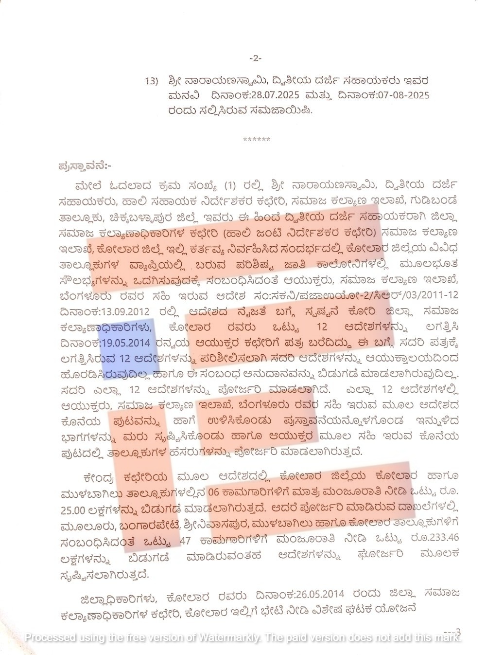 ಕೋಲಾರ ಜಿಲ್ಲೆಯ ವಿವಿಧ ತಾಲೂಕುಗಳ ವ್ಯಾಪ್ತಿಯಲ್ಲಿನ ಪರಿಶಿಷ್ಟ ಜಾತಿ ಕಾಲೋನಿಗಳಲ್ಲಿ ಮೂಲಭೂತ ಸೌಕರ್ಯಗಳನ್ನು ಒದಗಿಸಲು ಕೇಂದ್ರ ಕಚೇರಿ ಮೂಲಕ ಆದೇಶ ಹೊರಡಿಸಿತ್ತು. ಕೇಂದ್ರ ಕಚೇರಿಯ ಮೂಲ  ಆದೇಶದ ಪ್ರಕಾರ ಕೋಲಾರ ಜಿಲ್ಲೆಯ ಕೋಲಾರ ಹಾಗೂ ಮುಳಬಾಗಿಲು ತಾಲೂಕಿನಲ್ಲಿನ 6 ಕಾಮಗಾರಿಗಳಿಗೆ ಮಾತ್ರ ಅನುದಾನವು 2012ರಲ್ಲೇ   ಮಂಜೂರಾಗಿತ್ತು.   ಸಮಾಜ ಕಲ್ಯಾಣ ಇಲಾಖೆಯ ಕೇಂದ್ರ ಕಚೇರಿಯ ಮೂಲ ಆದೇಶದಲ್ಲಿ ಈ ಸಂಬಂಧ 12 ಆದೇಶಗಳನ್ನು 2012ರ ಸೆ.13ರಂದು  ಹೊರಡಿಸಲಾಗಿತ್ತು. ಈ ಆದೇಶಗಳಿಗೆ ಸಮಾಜ ಕಲ್ಯಾಣ ಇಲಾಖೆ ಆಯುಕ್ತರ ಸಹಿ ಕೂಡ ಇತ್ತು.