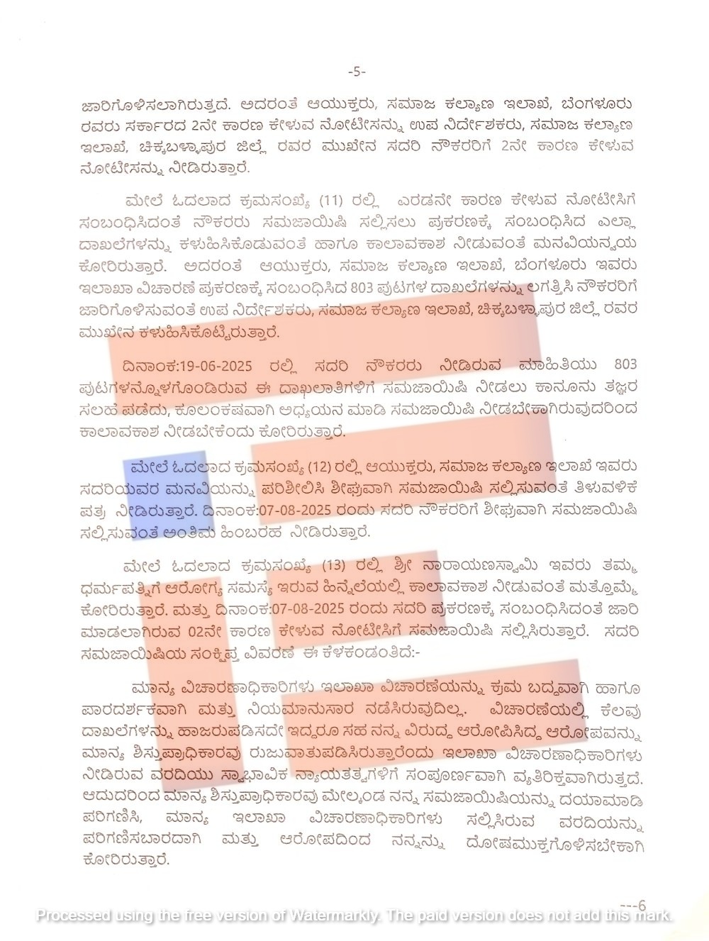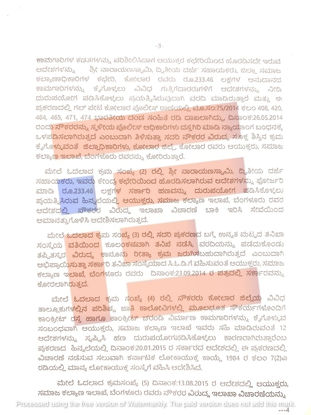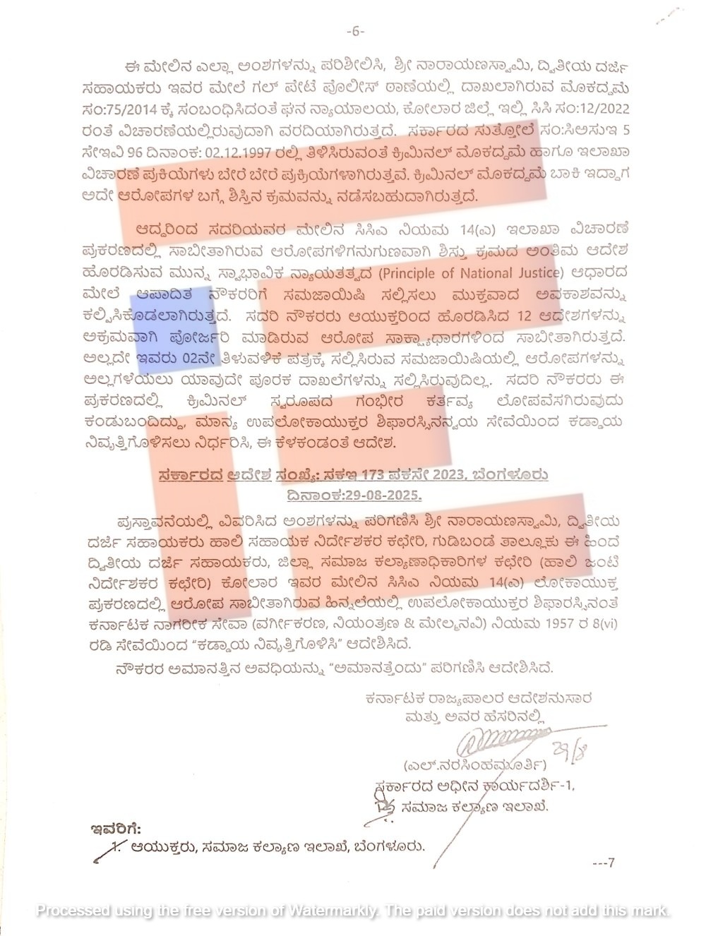 ಆದರೆ ಈ ಮಧ್ಯೆ ನಾರಾಯಣಸ್ವಾಮಿ ವಿರುದ್ಧ ಇಲಾಖೆ ವಿಚಾರಣೆ ಬಾಕಿ ಇರಿಸಿ ಅಮಾನತನ್ನು ತೆರವುಗೊಳಿಸಿತ್ತು. ಈ ಆರೋಪಿತ ನೌಕರನನ್ನು ಚಿಕ್ಕಬಳ್ಳಾಪುರ ಜಿಲ್ಲೆಯ ಗುಡಿಬಂಡೆ ತಾಲೂಕಿನ ಸಮಾಜ ಕಲ್ಯಾಣಾಧಿಕಾರಿ ಕಚೇರಿಯಲ್ಲಿ ದ್ವಿತೀಯ ದರ್ಜೆ ಸಹಾಯಕರ ಹುದ್ದೆಗೆ ಸ್ಥಳ ನಿಯುಕ್ತಿಗೊಳಿಸಿ ಆದೇಶ ಹೊರಡಿಸಲಾಗಿತ್ತು.