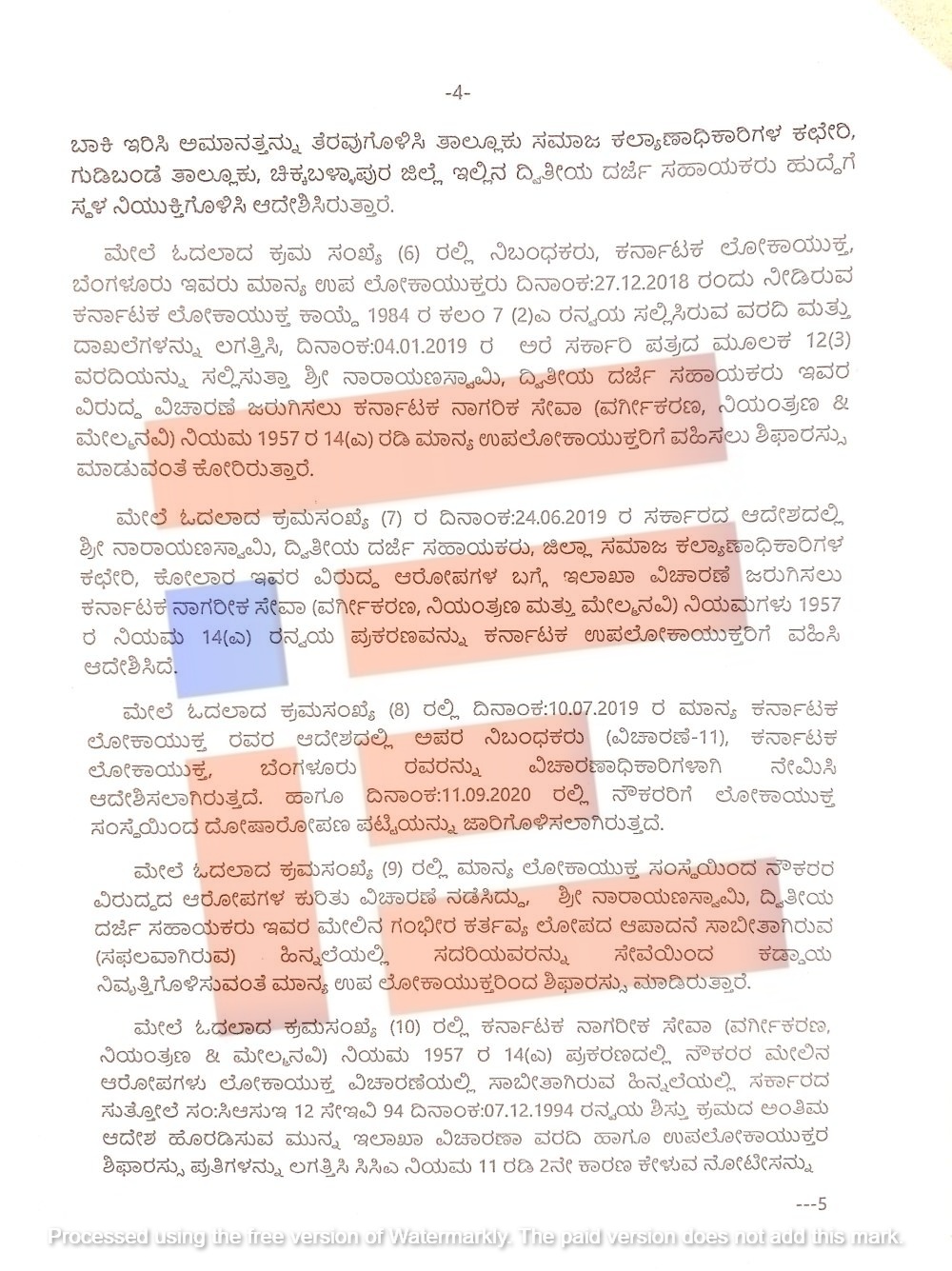 ಆಪಾದಿತ ನೌಕರ ನಾರಾಯಣಸ್ವಾಮಿ ಎಂಬಾತ ಲೋಕಾಯುಕ್ತರು ನೀಡಿದ್ದ ವರದಿಯನ್ನು ಪ್ರಶ್ನಿಸಿದ್ದ. ಅಲ್ಲದೇ ವಿಚಾರಣಾಧಿಕಾರಿಗಳ ವರದಿಯನ್ನು ಪರಿಗಣಿಸಬಾರದು ಮತ್ತು ಆರೋಪದಿಂದ ದೋಷಮುಕ್ತಗೊಳಿಸಬೇಕು ಎಂದು ಕೋರಿದ್ದ. ಆದರೆ ತನ್ನ ವಿರುದ್ಧದ ಆರೋಪಗಳನ್ನು ಅಲ್ಲಗಳೆಯಲು ಯಾವುದೇ ಪೂರಕ ದಾಖಲೆಗಳನ್ನು ಸಲ್ಲಿಸಿರಲಿಲ್ಲ.  ಹೀಗಾಗಿ ಉಪ ಲೋಕಾಯುಕ್ತರ ಶಿಫಾರಸ್ಸಿನ ಅನ್ವಯ 2025ರ ಆಗಸ್ಟ್‌ 29ರಂದು ನಾರಾಯಣಸ್ವಾಮಿ ಎಂಬಾತನನ್ನು ಸೇವೆಯಿಂದ ಕಡ್ಡಾಯವಾಗಿ ನಿವೃತ್ತಿಗೊಳಿಸಿ ಆದೇಶ ಹೊರಡಿಸಿದೆ.