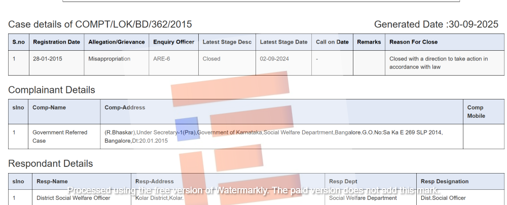 ಲೋಕಾಯುಕ್ತ ಸಂಸ್ಥೆಯು ಈ ಪ್ರಕರಣವನ್ನು 9 ವರ್ಷಗಳ ಕಾಲ ತನಿಖೆ  ನಡೆಸಿ ಸರ್ಕಾರಕ್ಕೆ ವರದಿಯನ್ನು ಸಲ್ಲಿಸಿದೆ. ಈ ವರದಿ ಸಲ್ಲಿಕೆಯಾಗಿ ಒಂದು ವರ್ಷದ ಬಳಿಕ ಸಮಾಜ ಕಲ್ಯಾಣ ಇಲಾಖೆಯು ಆರೋಪಿತ ನೌಕರನನ್ನು ಅಮಾನತುಗೊಳಿಸಿದೆ.