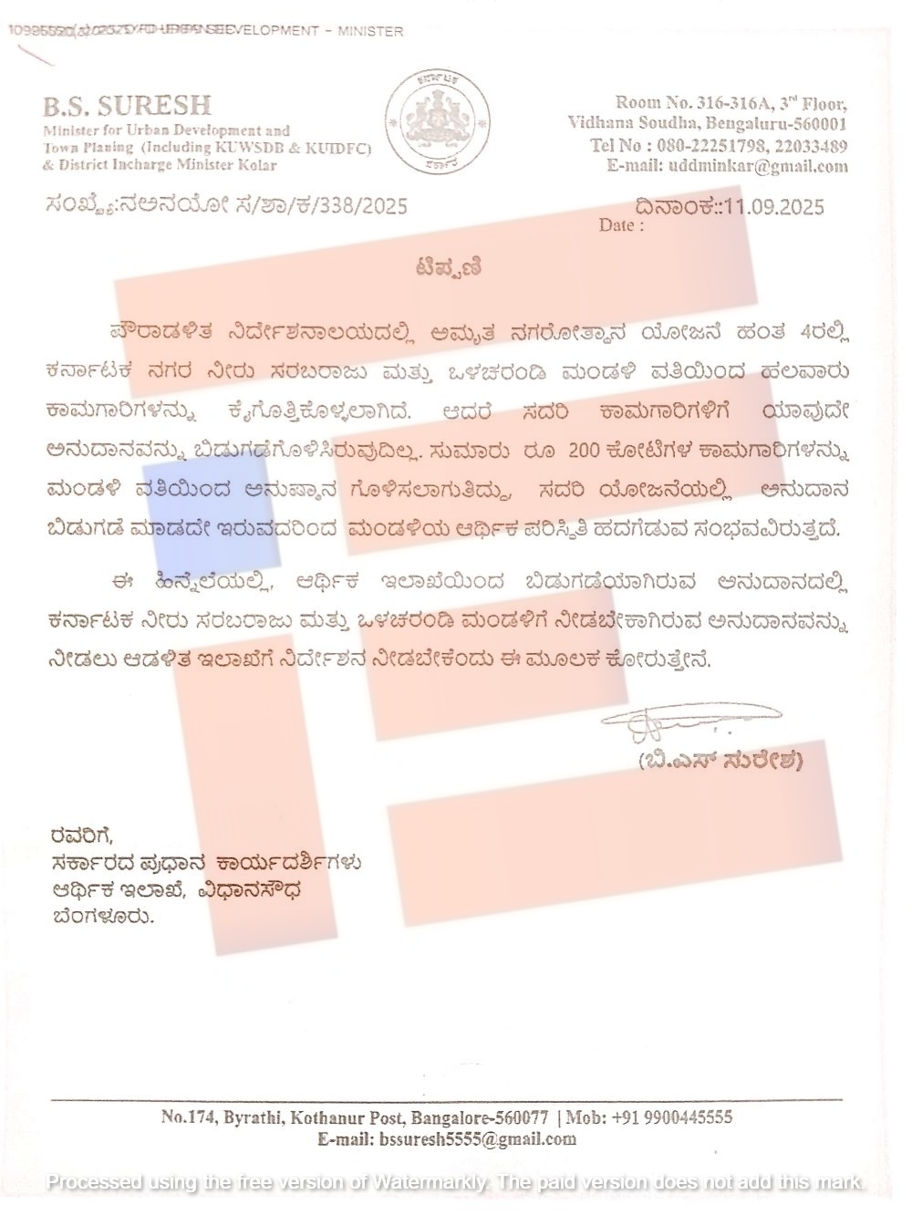 ನಗರಾಭಿವೃದ್ಧಿ ಸಚಿವ ಬೈರತಿ ಸುರೇಶ್‌ ಅವರು ಆರ್ಥಿಕ ಇಲಾಖೆಯ ಸರ್ಕಾರದ ಪ್ರಧಾನ ಕಾರ್ಯದರ್ಶಿಗೆ 2025ರ ಸೆ.11ರಂದು ಪತ್ರ ಬರೆದಿದ್ದಾರೆ. ಈ ಪತ್ರದ ಪ್ರತಿಯು ‘ದಿ ಫೈಲ್‌’ಗೆ ಲಭ್ಯವಾಗಿದೆ.