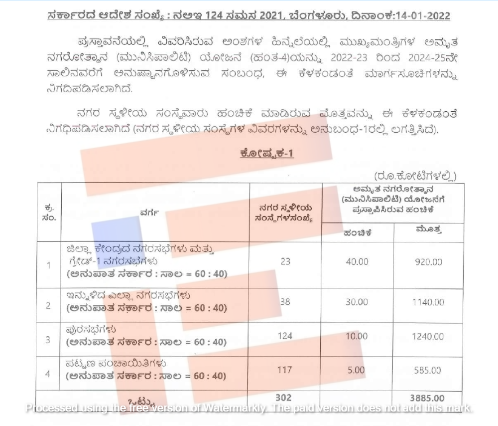 ಜಿಲ್ಲಾ ಕೇಂದ್ರದ ನಗರಸಭೆಗಳು ಮತ್ತು ಗ್ರೇಡ್‌ 1 ನಗರಸಭೆಗಳು (23) ಅಮೃತ ನಗರೋತ್ಥಾನ ಮುನಿಸಿಪಾಲಿಟಿ ಯೋಜನೆಗೆ 920.00 ಕೋಟಿ, ಇನ್ನುಳಿದ 38 ಎಲ್ಲಾ ನಗರಸಭೆಗಳು 1,1140 ಕೋಟಿ, ಪುರಸಭೆಗಳು 1,240 ಕೋಟಿ, 117 ಪಟ್ಟಣ ಪಂಚಾಯ್ತಿಗಳಿಗೆ 585 ಕೋಟಿ ಸೇರಿ ಒಟ್ಟಾರೆ 3,885 ಕೋಟಿ ರು.ಗಳನ್ನು ಒದಗಿಸಿತ್ತು.