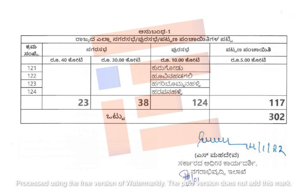 ಒಟ್ಟು 23 ನಗರಸಭೆಗಳಿಗೆ ತಲಾ 40 ಕೋಟಿ, ಇನ್ನುಳಿದ 38 ನಗರಸಭೆಗಳಿಗೆ ತಲಾ 30 ಕೋಟಿ, 124 ಪುರಸಭೆಗಳಿಗೆ ತಲಾ 10 ಕೋಟಿ, 117 ಪಟ್ಟಣ ಪಂಚಾಯ್ತಿಗಳಿಗೆ ತಲಾ 5 ಕೋಟಿ ರು ಗಳನ್ನು ಮಂಜೂರು ಮಾಡಿತ್ತು.