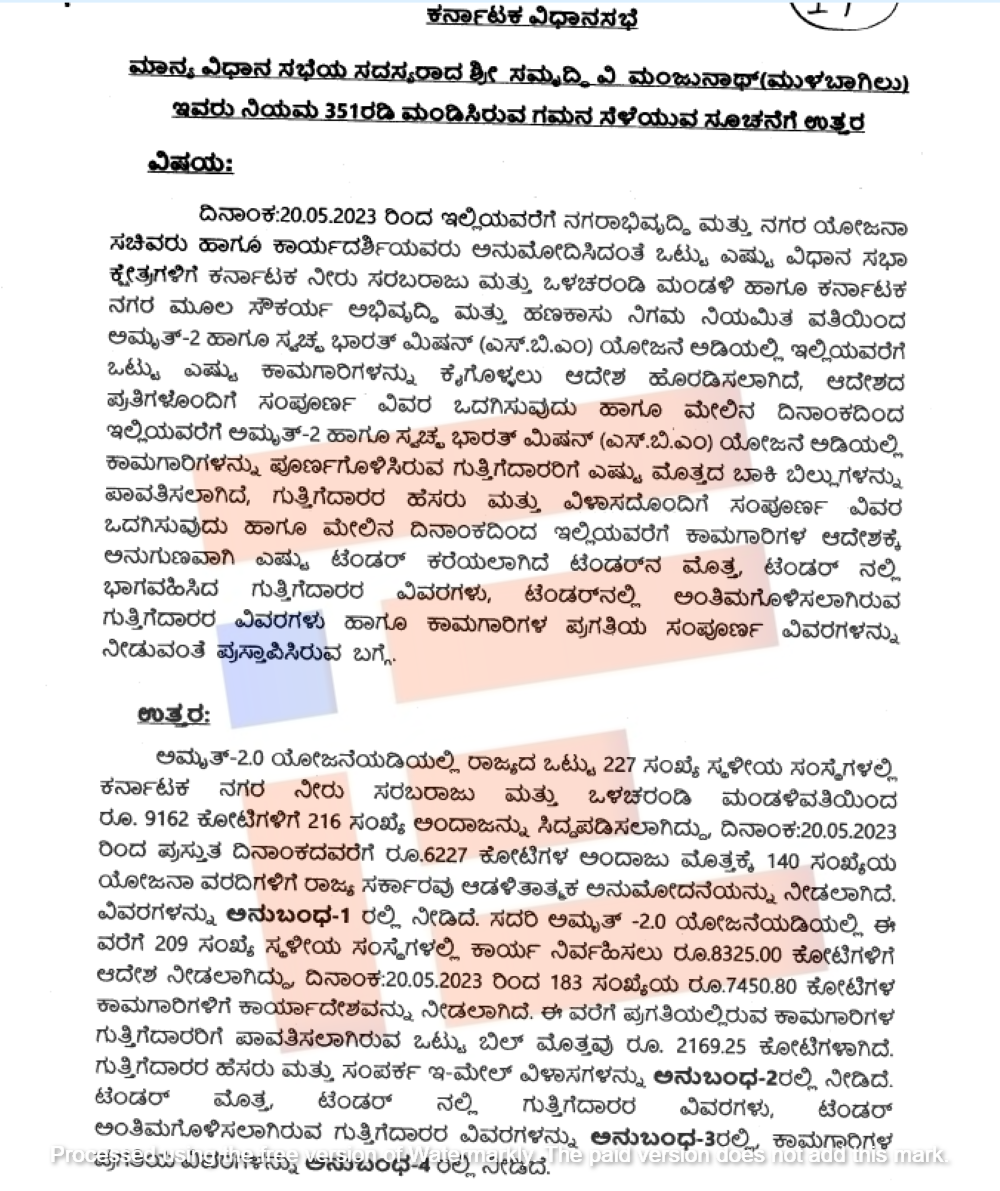 ಅಮೃತ್‌ 2.0 ಯೋಜನೆಯಡಿಯಲ್ಲಿ ರಾಜ್ಯದ ಒಟ್ಟು 227 ಸಂಖ್ಯೆ ಸ್ಥಳೀಯ ಸಂಸ್ಥೆಗಳಲ್ಲಿ ಕರ್ನಾಟಕ ನಗರ ನೀರು ಸರಬರಾಜು ಮತ್ತು ಒಳಚರಂಡಿ ಮಂಡಳಿಯಿಂದ 9,162 ಕೋಟಿ ರುಗಳಿಗೆ 216 ಸಂಖ್ಯೆಯ ಅಂದಾಜನ್ನು ಸಿದ್ಧಪಡಿಸಲಾಗಿದೆ. 2023ರ ಮೇ 20ರರಿಂದ ಇದುವರೆಗೆ 6,227 ಕೋಟಿ ರು.ಗಳ ಅಂದಾಜು ಮೊತ್ತಕ್ಕೆ 140 ಸಂಖ್ಯೆಯ ಯೋಜನಾ ವರದಿಗಳಿಗೆ ರಾಜ್ಯ ಸರ್ಕಾರವು ಆಡಳಿತಾತ್ಮಕ ಅನುಮೋದನೆ ನೀಡಿತ್ತು.