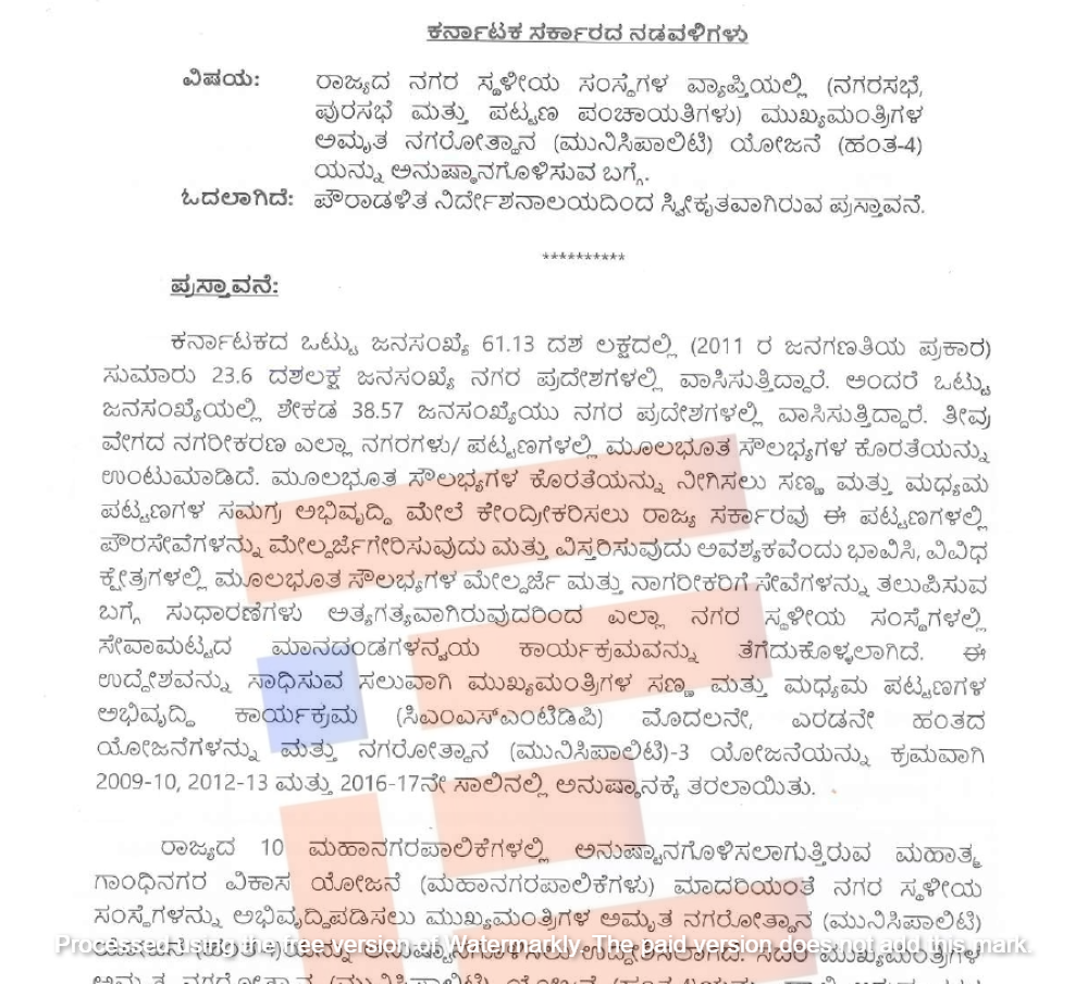 ಹೀಗಾಗಿ ಈ ಯೋಜನೆಗಳ ಪ್ರಗತಿಯು ಕುಂಠಿತವಾಗಿತ್ತು. ಹೀಗಾಗಿ ಮುಖ್ಯಮಂತ್ರಿಗಳ ಅಮೃತ ನಗರೋತ್ಥಾನ ಯೋಜನೆ (ಹಂತ 4) ರಲ್ಲಿ ಒದಗಿಸಿರುವ ಅನುದಾನದಲ್ಲಿ ಮೊದಲನೆಯ ಪ್ರಾಶಸ್ತ್ಯವನ್ನು ಕರ್ನಾಟಕ ನಗರ ನೀರು ಸರಬರಾಜು ಮತ್ತು ಒಳಚರಂಡಿ ಮಂಡಳಿ ವತಿಯಿಂದ ಕೈಗೊಂಡಿರುವ ಯೋಜನೆಗಳಿಗೆ ನಗರ ಸ್ಥಳೀಯ ಸಂಸ್ಥೆಗಳ ವಂತಿಕೆ ಇದ್ದಲ್ಲಿ ಅದಕ್ಕೆ ಕಡ್ಢಾಯವಾಗಿ ಮೀಸಲಿಡಬೇಕು ಎಂದು 2022ರಲ್ಲೇ ಆದೇಶ ಹೊರಡಿಸಿತ್ತು.