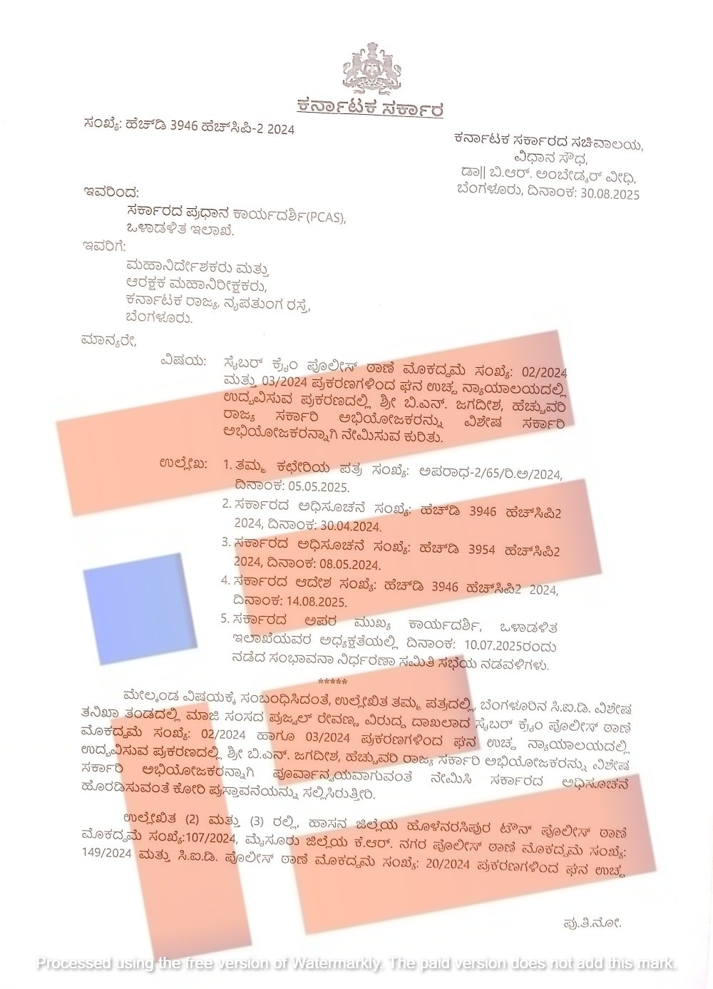 ಮಾಜಿ ಸಂಸದ ಪ್ರಜ್ವಲ್ ರೇವಣ್ಣ ವಿರುದ್ಧ ಬೆಂಗಳೂರಿನ ಸಿಐಡಿ ವಿಶೇಷ ತನಿಖಾ ತಂಡವು ಸೈಬರ್ ಕ್ರೈಂ ಪೊಲೀಸ್ ಠಾಣೆಯಲ್ಲಿ ಮೊಕದ್ದಮೆ (ಸಂಖ್ಯೆ; 02/2024 ಹಾಗೂ 03/2024) ದಾಖಲಿಸಿತ್ತು. ಈ ಪ್ರಕರಣಕ್ಕೆ ಸಂಬಂಧಿಸಿದಂತೆ ರಾಜ್ಯ ಉಚ್ಛ ನ್ಯಾಯಾಲಯದಲ್ಲಿ ಉದ್ಭವಿಸುವ ಪ್ರಕರಣದಲ್ಲಿ ಬಿ ಎನ್ ಜಗದೀಶ್ ಅವರನ್ನು ರಾಜ್ಯ ಸರ್ಕಾರಿ ಅಭಿಯೋಜಕರನ್ನು ವಿಶೇಷ ಸರ್ಕಾರಿ ಅಭಿಯೋಜಕರನ್ನಾಗಿ ಪೂರ್ವಾನ್ವಯವಾಗುವಂತೆ ನೇಮಿಸಲು ಪೊಲೀಸ್ ಮಹಾನಿರ್ದೇಶಕರು 2025ರ ಮೇ 5ರಂದು (ಪತ್ರ ಸಂಖ್ಯೆ ಅಪರಾಧ-2/65/ರಿ.ಅ/2024) ಸರ್ಕಾರವನ್ನು ಕೋರಿದ್ದರು.
