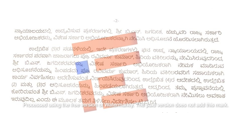 ಅಲ್ಲದೇ ಬಿ ಎನ್ ಜಗದೀಶ್ ಅವರನ್ನು ಈ ಪ್ರಕರಣದಲ್ಲಿ ವಿಶೇಷ ಸರ್ಕಾರಿ ಅಭಿಯೋಜಕರನ್ನಾಗಿ ನೇಮಿಸಲು ಅವಕಾಶವಿಲ್ಲ ಎಂದು ಸಹ ಸರ್ಕಾರವು ಸ್ಪಷ್ಪಪಡಿಸಿತ್ತು.