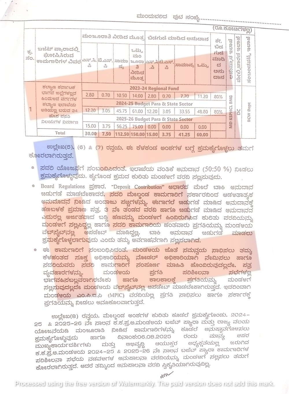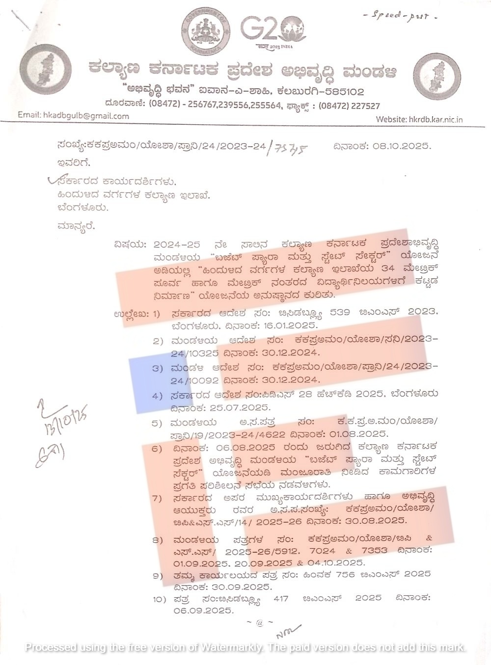 2024-25ನೇ ಸಾಲಿನ ಕಲ್ಯಾಣ ಕರ್ನಾಟಕ ಪ್ರದೇಶಾಭಿವೃದ್ಧಿ ಮಂಡಳಿಯ ಬಜೆಟ್ ಪ್ಯಾರಾ ಮತ್ತು ರಾಜ್ಯ ವಲಯ ಯೋಜನೆ ಅಡಿಯಲ್ಲಿ ಹಿಂದುಳಿದ ವರ್ಗಗಳ ಕಲ್ಯಾಣ ಇಲಾಖೆಯು ಕೈಗೆತ್ತಿಕೊಂಡಿರುವ 34 ವಸತಿ ನಿಲಯ ಕಾಮಗಾರಿಗಳಿಗೆ ಸಂಬಂಧಿಸಿದಂತೆ ಮಂಡಳಿಯ ಕಾರ್ಯದರ್ಶಿಯು ಹಿಂದುಳಿದ ವರ್ಗಗಳ ಕಲ್ಯಾಣ ಇಲಾಖೆಯ ಸರ್ಕಾರದ ಕಾರ್ಯದರ್ಶಿಗೆ ಪತ್ರ ಬರೆದಿದ್ದಾರೆ.
