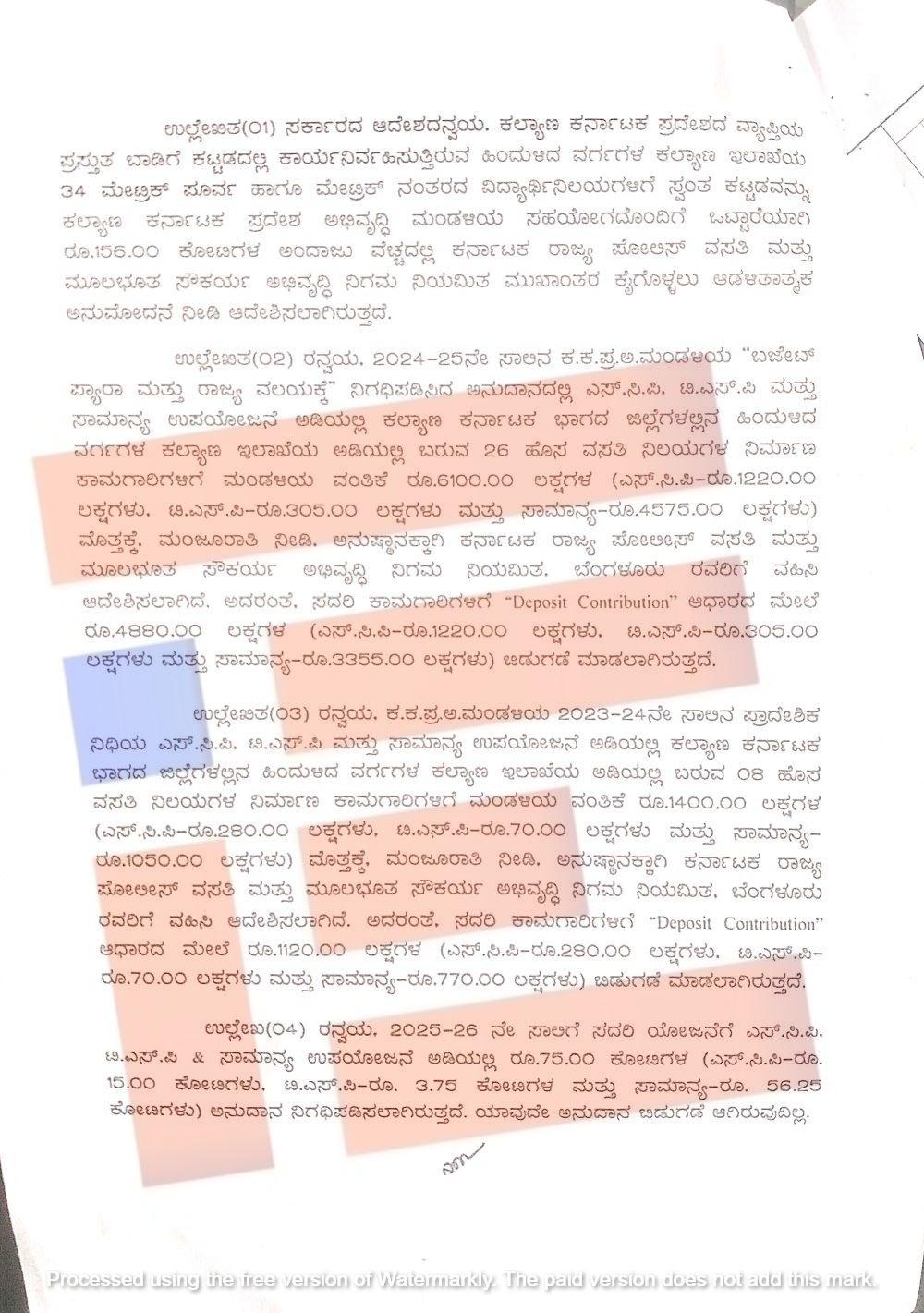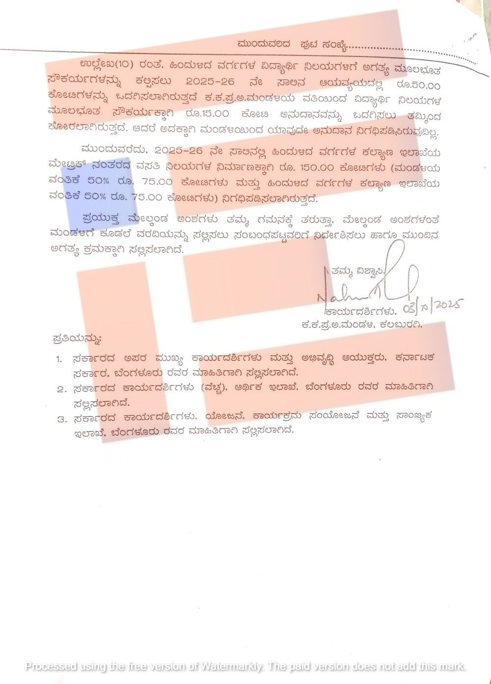 ಅಲ್ಲದೇ 2024-25ನೇ ಸಾಲಿನ ಕಲ್ಯಾಣ ಕರ್ನಾಟಕ ಪ್ರದೇಶಾಭಿವೃದ್ಧಿ ಮಂಡಳಿಯ ಬಜೆಟ್ ಪ್ಯಾರಾ ಮತ್ತು ರಾಜ್ಯ ವಲಯಕ್ಕೆ ನಿಗದಿಪಡಿಸಿದ ಅನುದಾನದಲ್ಲಿ ಎಸ್ಸಿಎಸ್ಪಿ ಮತ್ತು ಟಿಎಸ್ಪಿ ಮತ್ತು ಸಾಮಾನ್ಯ ಉಪಯೋಜನೆ ಅಡಿಯಲ್ಲಿಯೂ ಅನುದಾನ ಒದಗಿಸಿಕೊಂಡಿತ್ತು. ಕಲ್ಯಾಣ ಕರ್ನಾಟಕ ಭಾಗದ ಜಿಲ್ಲೆಗಳಲ್ಲಿನ ಹಿಂದುಳಿದ ವರ್ಗಗಳ ಕಲ್ಯಾಣ ಇಲಾಖೆ ಅಡಿಯಲ್ಲಿ ಬರುವ 26 ಹೊಸ ವಸತಿ ನಿಲಯಗಳ ನಿರ್ಮಾಣ ಕಾಮಗಾರಿಗಳಿಗೆ ಮಂಡಳಿಯ ವಂತಿಕೆ 61 ಕೋಟಿ ರು ಮೊತ್ತಕ್ಕೆ ಮಂಜೂರಾತಿ ನೀಡಿತ್ತು. ಈ ಪೈಕಿ 48.80 ಕೋಟಿ ರು ಬಿಡುಗಡೆ ಮಾಡಿತ್ತು ಎಂಬುದು ಪತ್ರದಿಂದ ಗೊತ್ತಾಗಿದೆ.