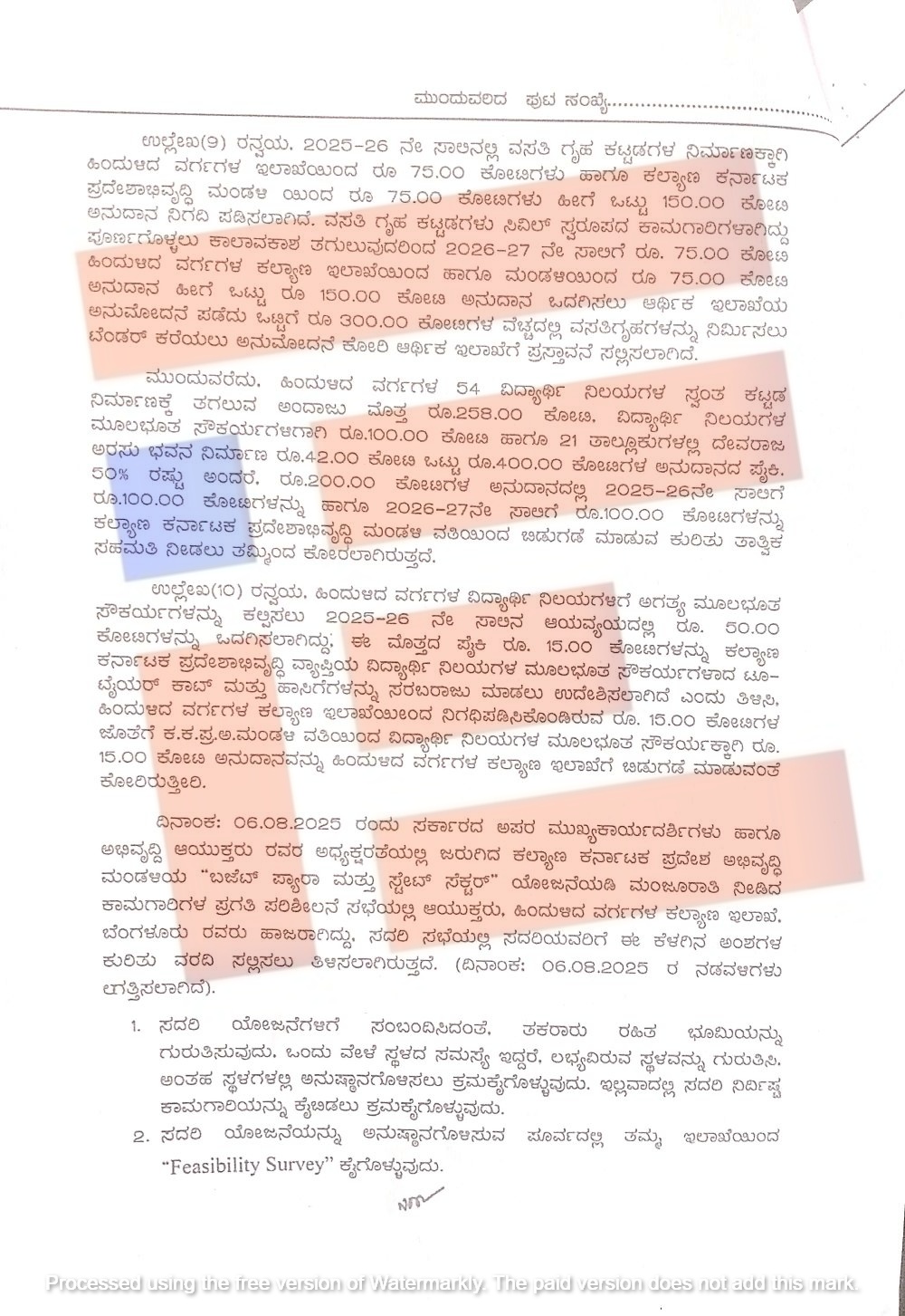 ಇದಲ್ಲದೇ ಹಿಂದುಳಿದ ವರ್ಗಗಳ 54 ವಿದ್ಯಾರ್ಥಿ ನಿಲಯಗಳ ಸ್ವಂತ ಕಟ್ಟಡ ನಿರ್ಮಾಣಕ್ಕೆ ತಗಲುವ ಅಂದಾಜು ವೆಚ್ಚ 258 ಕೊಟಿ, ವಿದ್ಯಾರ್ಥಿ ನಿಲಯಗಳ ಮೂಲಭೂತ ಸೌಕರ್ಯಗಳಿಗಾಗಿ 100 ಕೋಟಿ ಹಾಗೂ 21 ತಾಲೂಕುಗಳಲ್ಲಿ ದೇವರಾಜ ಅರಸು ಭವನ ನಿರ್ಮಾಣಕ್ಕೆ 42 ಕೋಟಿ ಒಟ್ಟು 400 ಕೊಟಿ ರು.ಗಳ ಅನುದಾನವಿದೆ. ಈ ಪೈಕಿ ಶೇ. 50ರಷ್ಟು ಅಂದರೇ 200 ಕೋಟಿ ರು.ಗಳ ಅನುದಾನದಲ್ಲಿ 2025-26ನೇ ಸಾಲಿಗೆ 100 ಕೋಟಿ ರು.ಗಳನ್ನು 2026-27ನೇ ಸಾಲಿಗೆ 100 ಕೋಟಿ ರು.ಗಳನ್ನು ಕಲ್ಯಾಣ ಕರ್ನಾಟಕ ಪ್ರದೇಶಾಭಿವೃದ್ಧಿ ಮಂಡಳಿಯಿಂದ ಬಿಡುಗಡೆ ಮಾಡಲು ತಾತ್ವಿಕ ಸಹಮತಿ ಕೋರಿ ಕೋರಿರುವುದು ಗೊತ್ತಾಗಿದೆ.