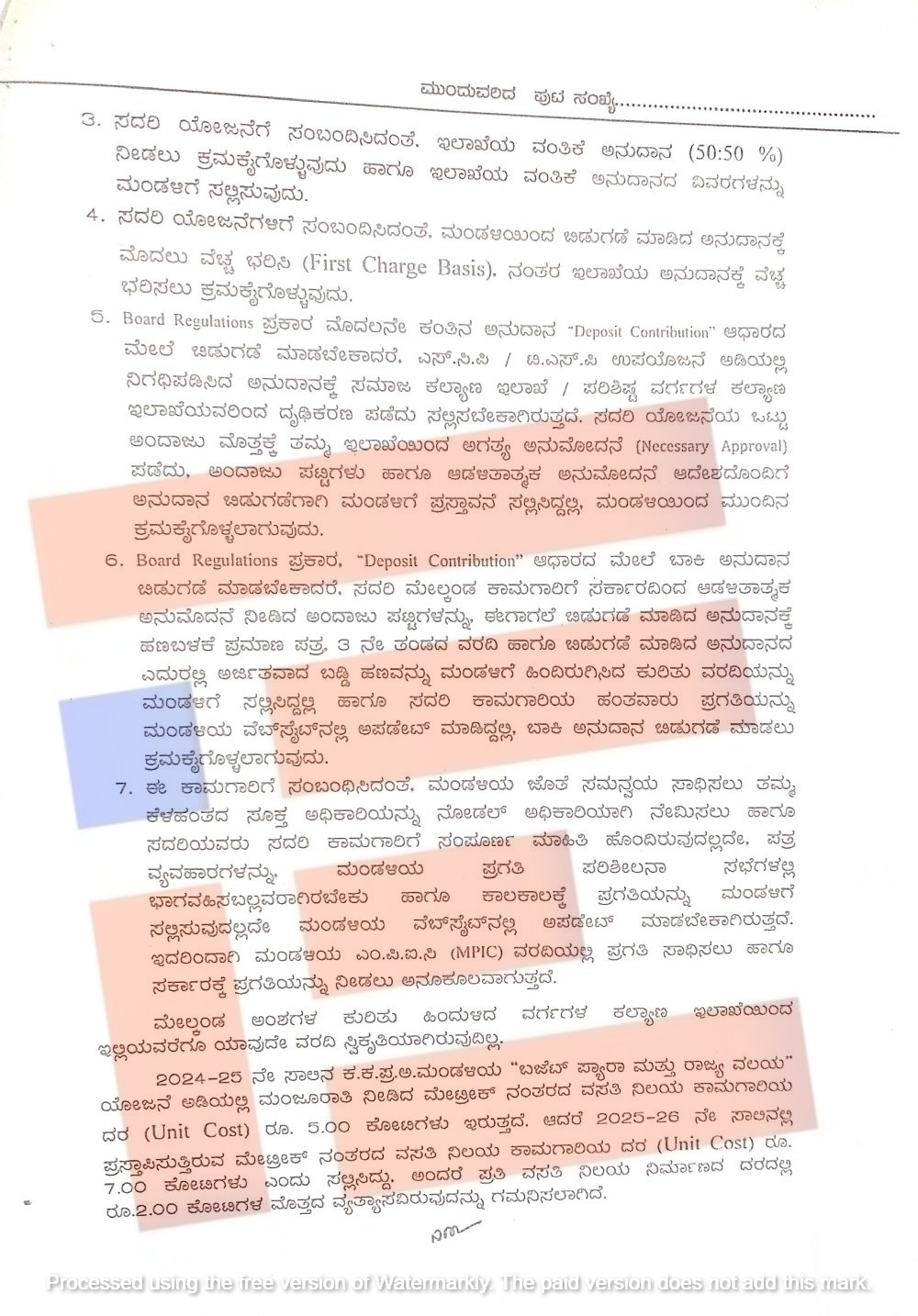 ಇಲಾಖೆ ವಂತಿಕೆ ಅನುದಾನ ವಿವರಗಳು, ಮಂಡಳಿಯಿಂದ ಬಿಡುಗಡೆ ಮಾಡದ ಅನುದಾನಕ್ಕೆ ಮೊದಲು ವೆಚ್ಚ ಭರಿಸಿ ನಂತರ ಇಲಾಖೆಯ ಅನುದಾನಕ್ಕೆ ವೆಚ್ಚ ಭರಿಸುವುದು, ನಿಗದಿಪಡಿಸಿದ ಅನುದಾನಕ್ಕೆ ಸಮಾಜ ಕಲ್ಯಾಣ, ಪರಿಶಿಷ್ಟ ವರ್ಗಗಳ ಕಲ್ಯಾಣ ಇಲಾಖೆಯಿಂದ ದೃಢೀಕರಣ ಪತ್ರ ಪಡೆಯುವುದು, ಈ ಯೋಜನೆಯ ಒಟ್ಟು ಅಂದಾಜು ಮೊತ್ತಕ್ಕೆ ಇಲಾಖೆಯಿಂದ ಅಗತ್ಯ ಅನುಮೋದನೆ ಪಡೆಯುವುದು, ಅಂದಾಜು ಪಟ್ಟಿಗಳು, ಆಡಳಿತಾತ್ಮಕ ಆದೇಶದೊಂದಿಗೆ ಅನುದಾನ ಬಿಡುಗಡೆಗಾಗಿ ಮಂಡಳಿಗೆ ಪ್ರಸ್ತಾವನೆ ಸಲ್ಲಿಸಿಲ್ಲ ಎಂಬುದು ಪತ್ರದಿಂದ ಗೊತ್ತಾಗಿದೆ.