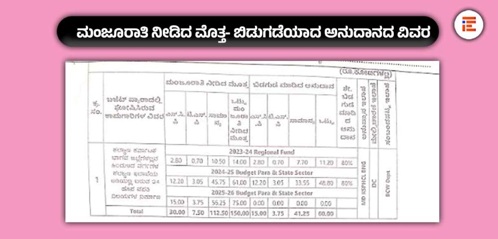 2025-26ನೇ ಸಾಲಿನ ಈ ಯೋಜನೆಗೆ ಎಸ್ಸಿಸಿಪಿ ಮತ್ತು ಟಿಎಸ್ಪಿ ಸಾಮಾನ್ಯ ಉಪಯೋಜನೆ ಅಡಿಯಲ್ಲಿ 75 ಕೋಟಿ ರು ಮೊತ್ತಕ್ಕೆ ಅನುದಾನ ನಿಗದಿಪಡಿಸಿದೆ. ಆದರೆ ಯಾವುದೇ ಅನುದಾನ ಬಿಡುಗಡೆ ಆಗಿಲ್ಲ ಎಂಬುದು ಪತ್ರದಿಂದ ತಿಳಿದು ಬಂದಿದೆ.