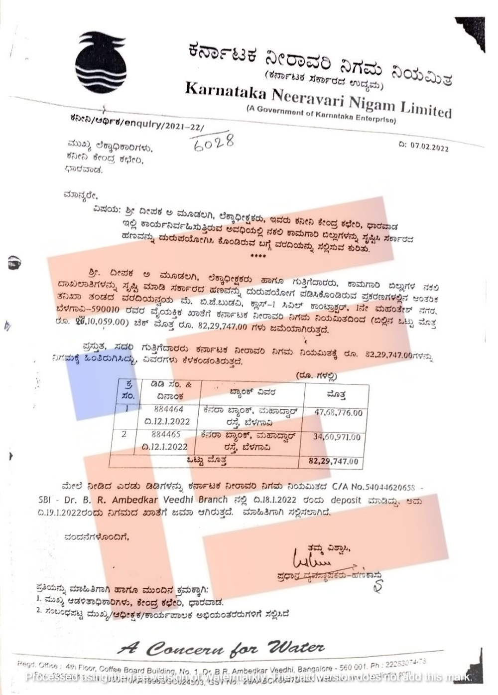 47,68,776 ರು. ಮತ್ತು 34,60,971 ರು. ಸೇರಿ ಒಟ್ಟಾರೆ 82,29,747 ರು.ಗಳನ್ನು ಬೆಳಗಾವಿಯ ಮಹಾದ್ವಾರ್ನಲ್ಲಿರುವ ಕೆನರಾ ಬ್ಯಾಂಕ್ನ ಶಾಖೆಯಲ್ಲಿ ಜಮೆ ಮಾಡಲಾಗಿದೆ ಎಂದು ಕರ್ನಾಟಕ ನೀರಾವರಿ ನಿಗಮವು 2022ರ ಫೆ.7ರಂದು ಮುಖ್ಯ ಲೆಕ್ಕಾಧಿಕಾರಿಗಳಿಗೆ ವರದಿ ಮಾಡಿತ್ತು.