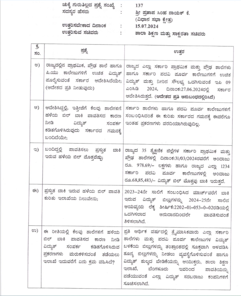 ರಾಜ್ಯದ 35 ಶೈಕ್ಷಣಿಕ ಜಿಲ್ಲೆಗಳ ಸರ್ಕಾರಿ ಪ್ರಾಥಮಿಕ ಮತ್ತು ಪ್ರೌಢಶಾಲೆಗಳಲ್ಲಿ 2024ರ ಮಾರ್ಚ್ 31ರವರೆಗೆ ಅಂದಾಜು 9.78 ಕೋಟಿ ರು ಮತ್ತು ರಾಜ್ಯದ ಎಲ್ಲಾ 1,234 ಸರ್ಕಾರಿ ಪದವಿಪೂರ್ವ ಕಾಲೇಜುಗಳಲ್ಲಿ ಅಂದಾಜು 68,85, 483 ರು. ವಿದ್ಯುತ್ ಬಿಲ್ ಮೊತ್ತವು ಬಾಕಿ ಇತ್ತು. ಈ ಬಗ್ಗೆ ಖುದ್ದು ಸಚಿವ ಮಧು ಬಂಗಾರಪ್ಪ ಅವರು 2024ರ ಜುಲೈ 15ರಂದೇ ವಿಧಾನಪರಿಷತ್ಗೆ ಲಿಖಿತ ಉತ್ತರ ಒದಗಿಸಿದ್ದರು.