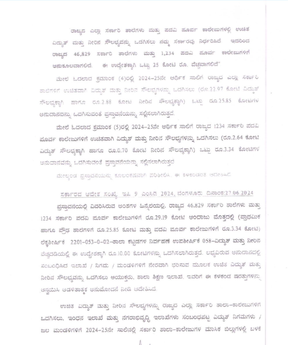 ರಾಜ್ಯದ 46,829 ಸರ್ಕಾರಿ ಶಾಲೆಗಳು ಮತ್ತು 1,234 ಸರ್ಕಾರಿ ಪದವಿಪೂರ್ವ ಕಾಲೇಜುಗಳಿಗೆ 29.19 ಕೋಟಿ ರು.ಗಳ ಅಂದಾಜು ಮೊತ್ತದಲ್ಲಿ (ಪ್ರಾಥಮಿಕ ಹಾಗೂ ಪ್ರೌಢಶಾಲೆಗಳಿಗೆ 25.85 ಕೋಟಿ ರು., ಪದವಿಪೂರ್ವ ಕಾಲೇಜುಗಳಿಗೆ 3.34 ಕೋಟಿ ರು) ವಿದ್ಯುತ್ ಮತ್ತು ನೀರಿನ ಬಿಲ್ ಪಾವತಿಸಲು ಉದ್ದೇಶಿಸಿತ್ತು. ಶಾಲಾ ಕಟ್ಟಡಗಳ ನಿರ್ವಹಣೆ ಉಪ ಶೀರ್ಷಿಕೆಯಡಿಯಲ್ಲಿ ಲಭ್ಯವಿದ್ದ ಅನುದಾನದ ಪೈಕಿ 10 ಕೋಟಿ ರು ಗಳನ್ನು ಒದಗಿಸಿತ್ತು. ಈ ಹಣವನ್ನು ನೇರವಾಗಿ ವಿದ್ಯುತ್ ಸರಬರಾಜು ಕಂಪನಿಗಳಿಗೆ ಪಾವತಿಸಲು 2024ರ ಜೂನ್ 27ರಂದೇ ಆದೇಶಿಸಿತ್ತು.