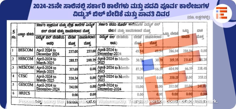 ಬೆಸ್ಕಾಂಗೆ 2024ರ ಏಪ್ರಿಲ್ನಿಂದ ಡಿಸೆಂಬರ್ 2024ರವರೆಗೆ ಸರ್ಕಾರಿ ಪ್ರಾಥಮಿಕ ಮತ್ತು ಪ್ರೌಢಶಾಲೆಗಳ ವಿದ್ಯುತ್ ಬಿಲ್ ಒಟ್ಟಾರೆ 2.37 ಕೋಟಿ ರು ಬೇಡಿಕೆ ಇತ್ತು. ಈ ಅವಧಿಯ ಬೇಡಿಕೆ ಪ್ರಕಾರ 2.37 ಕೋಟಿ ರುಗಳನ್ನು ಶಾಲಾ ಶಿಕ್ಷಣ ಮತ್ತು ಸಾಕ್ಷರತೆ ಇಲಾಖೆಯುಕ ಪಾವತಿಸಿತ್ತು. ಹೆಸ್ಕಾಂ ಗೆ 2024ರ ಏಪ್ರಿಲ್ನಿಂದ 2025ರ ಮಾರ್ಚ್ ಅವಧಿಯವರೆಗೆ 2.88 ಕೋಟಿ ರು ಬೇಡಿಕೆ ಇತ್ತು. ಈ ಪೈಕಿ 2.00 ಕೋಟಿ ರು ಪಾವತಿಸಿತ್ತು. ಇನ್ನುಳಿದ 88 ಲಕ್ಷ ರು ಬಾಕಿ ಇರಿಸಿಕೊಂಡಿತ್ತು.