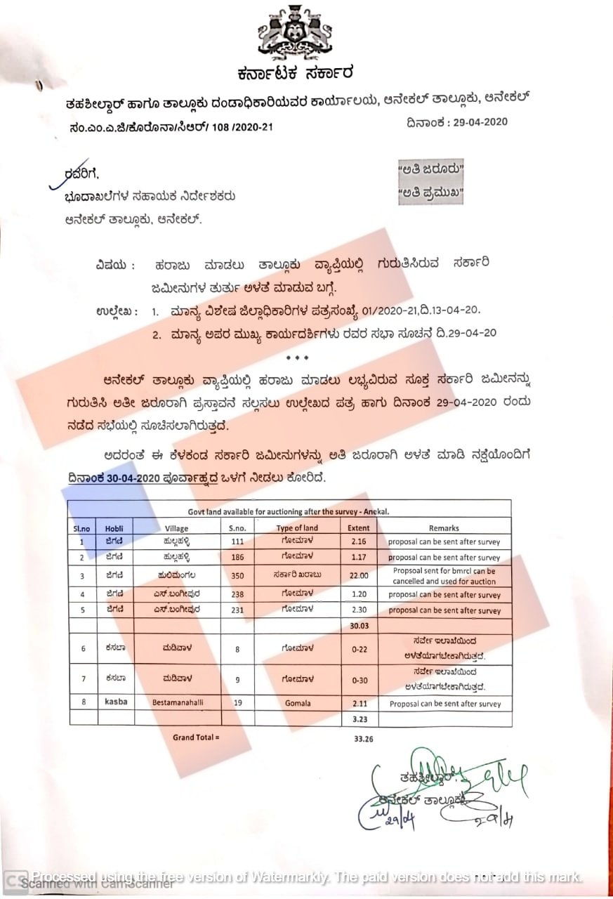 ಅದೇ ರೀತಿ ಬೆಂಗಳೂರು ನಗರ ಜಿಲ್ಲೆ ವ್ಯಾಪ್ತಿಯಲ್ಲಿ ಒತ್ತುವರಿಯಿಂದ ಈಗಾಗಲೇ ತೆರವುಗೊಳಿಸಿರುವ ಸರ್ಕಾರಿ ಜಮೀನುಗಳನ್ನು ಹರಾಜು ಹಾಕಲು ಜಾರಿ ದಳದ ವಿಶೇಷ ಜಿಲ್ಲಾಧಿಕಾರಿ 2020ರ ಏಪ್ರಿಲ್ 13ರಂದೇ ಬೆಂಗಳೂರು ಉತ್ತರ ಮತ್ತು ದಕ್ಷಿಣ ವಿಭಾಗದ ಉಪ ವಿಭಾಗಾಧಿಕಾರಿಗಳಿಗೆ ಪತ್ರ ಬರೆದಿದ್ದರು.