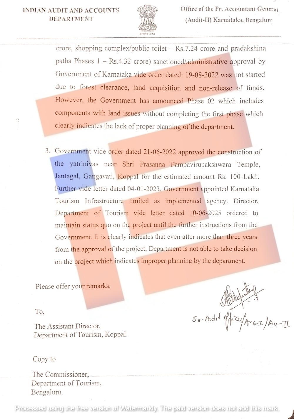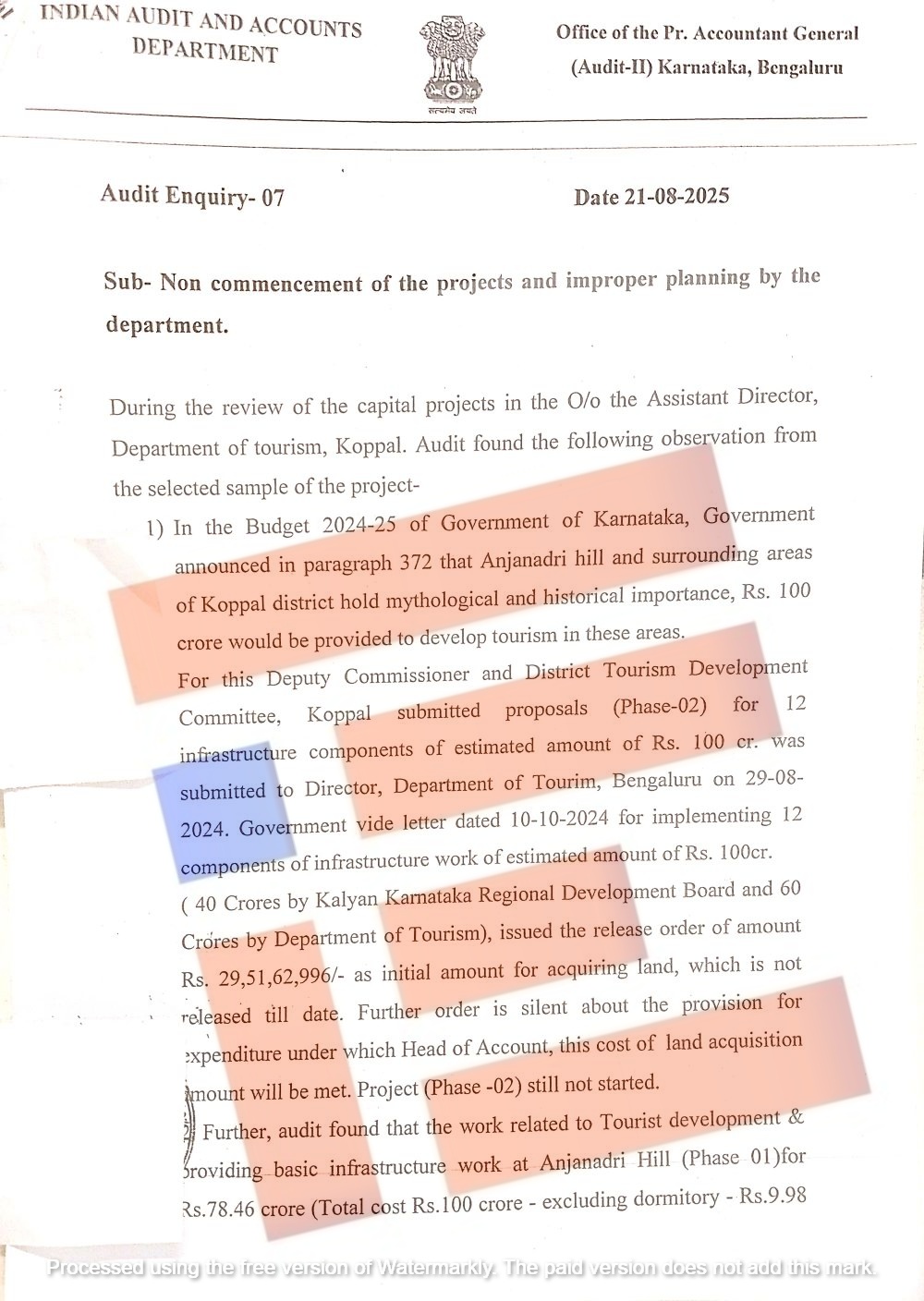 ಪ್ರವಾಸೋದ್ಯಮ ಇಲಾಖೆಯ ಈ ನಿರ್ಲಕ್ಷ್ಯ ಮತ್ತು ಯೋಜನೆಯ ಮೇಲ್ವಿಚಾರಣೆಯಲ್ಲಿನ ಕೊರತೆಗಳ ಕುರಿತು ಇಂಡಿಯನ್ ಆಡಿಟ್ ಅಂಡ್ ಅಕೌಂಟೆಂಟ್ ಜನರಲ್ ಅವರು 2025ರ ಆಗಸ್ಟ್ 21ರಂದು ಪ್ರವಾಸೋದ್ಯಮ ಇಲಾಖೆಯ ಆಯುಕ್ತರಿಗೆ ಆಕ್ಷೇಪಣೆ ವ್ಯಕ್ತಪಡಿಸಿ ಪತ್ರ ಬರೆದಿದ್ದಾರೆ. ಈ ಪತ್ರದ ಪ್ರತಿಯು ‘ದಿ ಫೈಲ್’ಗೆ ಲಭ್ಯವಾಗಿದೆ.