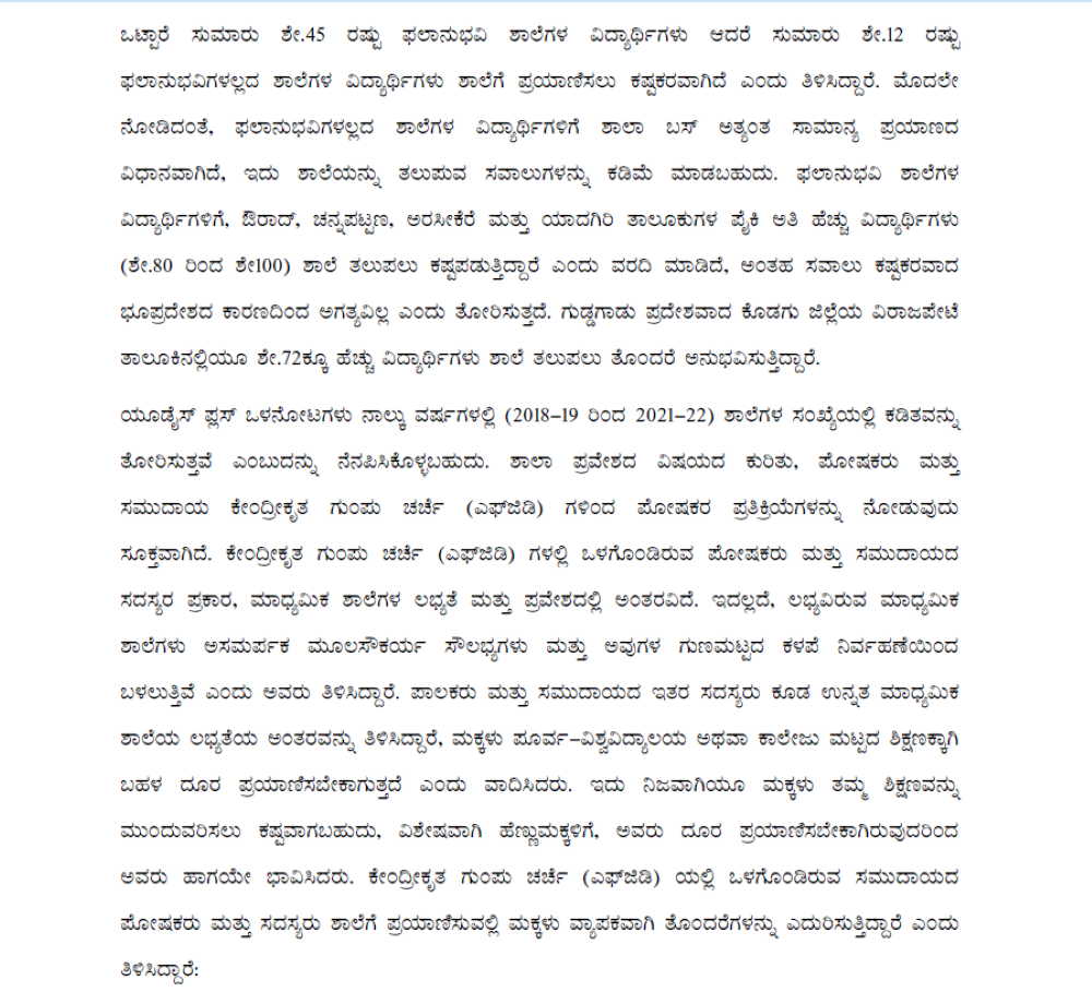 ಕೊಡಗಿನಲ್ಲಿ ವಿದ್ಯಾರ್ಥಿಗಳು ಹೆಚ್ಚು ದೂರ ಮತ್ತು ಸವಾಲಿನ ಭೂ ಪ್ರದೇಶದ ರಸ್ತೆಗಳ ಕೊರತೆಗಳ ಕಾರಣ ಶಾಲೆ ತಲುಪಲು ಹಲವು ಸಮಸ್ಯೆಗಳನ್ನು ಎದುರಿಸುತ್ತಿದ್ದಾರೆ ಎಂದು ವರದಿಯಲ್ಲಿ ವಿವರಿಸಿರುವುದು ಗೊತ್ತಾಗಿದೆ.