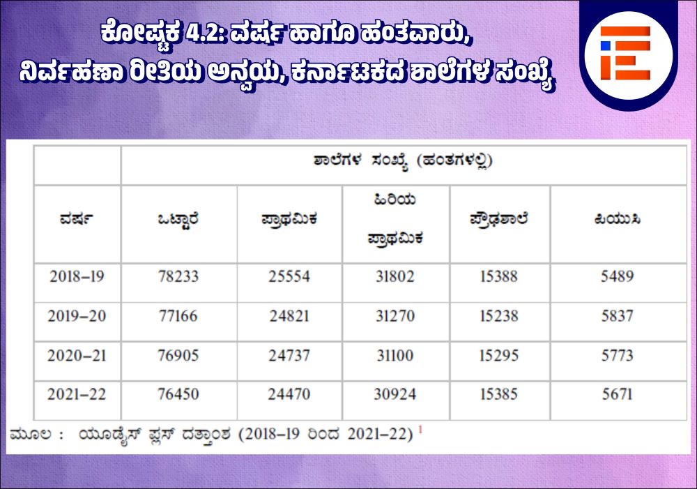 2018-19 ಮತ್ತು 2021-22ರ ನಡುವೆ ಪಿಯುಸಿ ಹೊರತುಪಡಿಸಿ ಎಲ್ಲಾ ಶಾಲಾ ಹಂತಗಳಿಗೆ ಶಾಲೆಗಳ ಸಂಖ್ಯೆ ಕುಸಿದಿದೆ. ರಾಜ್ಯದಲ್ಲಿ ಶೇ.65ರಷ್ಟು ಸರ್ಕಾರಿ ಶಾಲೆಗಳಿವೆ. ಆದರೆ ಒಟ್ಟಾರೆ ದಾಖಲಾತಿಯಲ್ಲಿ ಒಟ್ಟಾರೆಯಾಗಿ ಹೆಚ್ಚಿಗೆಯಾಗಿಲ್ಲ. ಕೇವಲ ಶೇ. 45ರಷ್ಟು ಮಾತ್ರ ದಾಖಲಾತಿ ಇದೆ. ಖಾಸಗಿ ಅನುದಾನ ರಹಿತ ಶಾಲೆಗಳ ದಾಖಲಾತಿಯಲ್ಲಿ ಶೇ. 40ಕ್ಕಿಂತ ಹೆಚ್ಚಿನ ಪಾಲು ಹೊಂದಿದೆ.