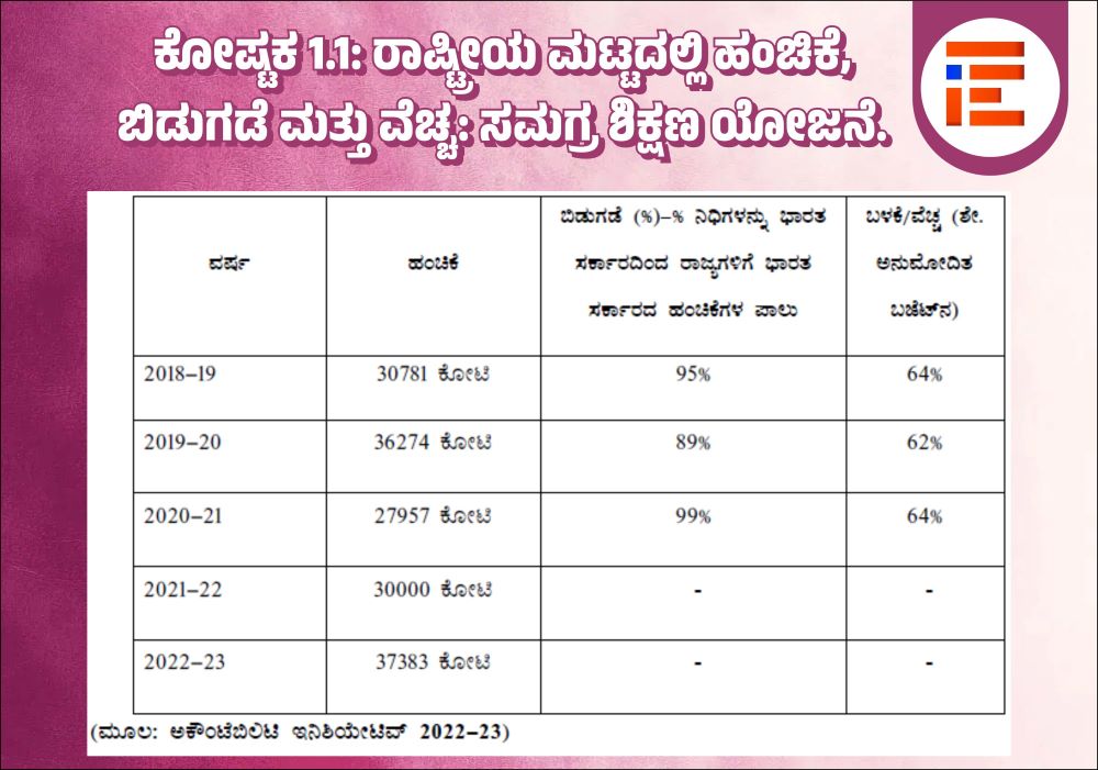 ಸಮಗ್ರ ಶಿಕ್ಷಣ ಯೋಜನೆಯು ಕೇಂದ್ರ ಸರ್ಕಾರದ ಪ್ರಾಯೋಜಿತವಾಗಿದೆ. ಇದು 60;40ರ ಅನುಪಾತದಲ್ಲಿ ಅನುದಾನ ಹಂಚಿಕೆಯಾಗುತ್ತದೆ. 2018-19ರಲ್ಲಿ 30,781 ಕೋಟಿ ರು ಹಂಚಿಕೆಯಾಗಿತ್ತು. ಅದೇ ರೀತಿ 2019-20ರಲ್ಲಿ 36,274 ಕೋಟಿ, 2020-21ರಲ್ಲಿ 29,957 ಕೋಟಿ, 2021-22ರಲ್ಲಿ 30,000 ಕೋಟಿ, 2022-23ರಲ್ಲಿ 37,383 ಕೋಟಿ ರು.ಗಳನ್ನು ರಾಜ್ಯಗಳಿಗೆ ಹಂಚಿಕೆ ಮಾಡಲಾಗಿತ್ತು. ಇದು ಬಜೆಟ್ನ ಒಟ್ಟಾರೆ ಶೇ.64, 62. 64ರಷ್ಟಿತ್ತು. 2019-20ರಿಂದ 2020-21ರವರೆಗೆ ಈ ಅನುದಾನ ಹಂಚಿಕೆಯಲ್ಲಿ ಗಮನಾರ್ಹವಾಗಿ ಕುಸಿದಿದೆ ನಂತರದಲ್ಲಿ ಏರಿಕೆಯಾಗಿದೆ ಎಂದು ವರದಿಯಲ್ಲಿ ವಿಶ್ಲೇಷಿಸಿರುವುದು ಗೊತ್ತಾಗಿದೆ.
