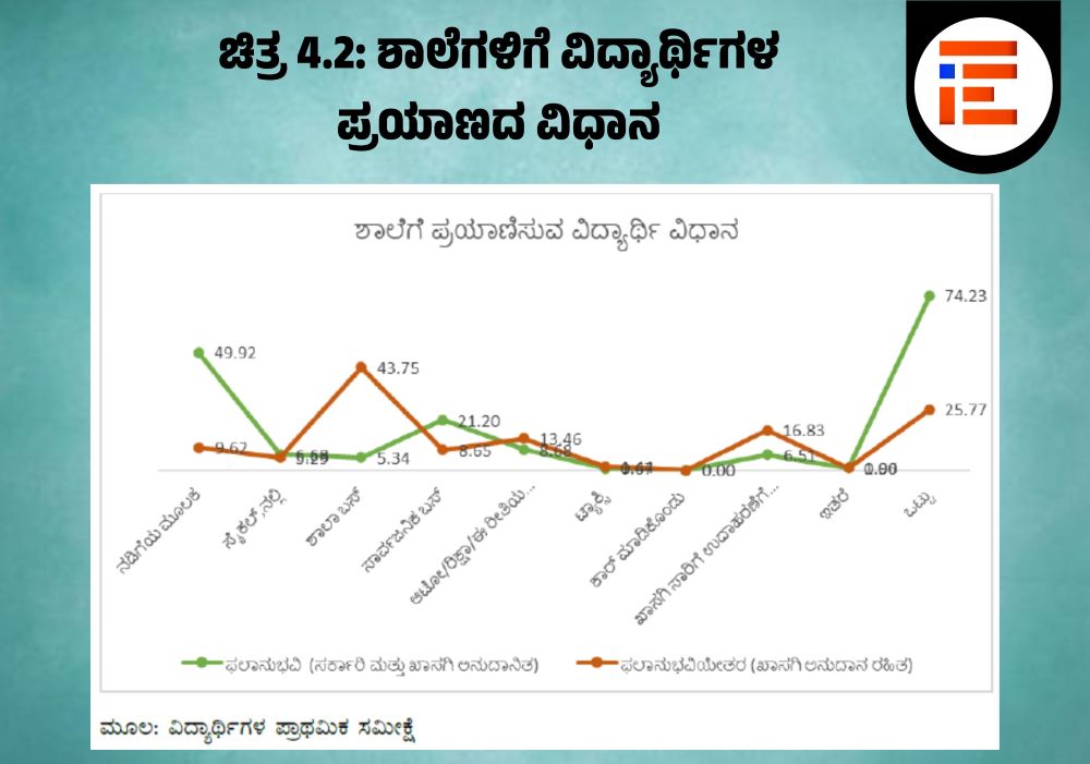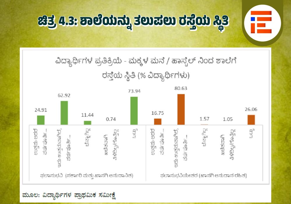 ಸುಮಾರು ಶೇ. 45ರಷ್ಟು ಫಲಾನುಭವಿ ಶಾಲೆಗಳ ವಿದ್ಯಾರ್ಥಿಗಳು ಮತ್ತು ಸುಮಾರು ಶೇ. 12ರಷ್ಟು ಫಲಾನುಭವಿಗಳಲ್ಲದ ಶಾಲೆಗಳ ವಿದ್ಯಾರ್ಥಿಗಳು ಶಾಲೆಗೆ ಪ್ರಯಾಣಿಸಲು ಕಷ್ಟಕರವಾಗಿದೆ. ಫಲಾನುಭವಿಗಳಲ್ಲದ ಶಾಲೆಗಳ ವಿದ್ಯಾರ್ಥಿಗಳಿಗೆ ಶಾಲಾ ಬಸ್ ಅತ್ಯಂತ ಸಾಮಾನ್ಯ ಪ್ರಯಾಣದ ವಿಧಾನವಾಗಿದೆ.