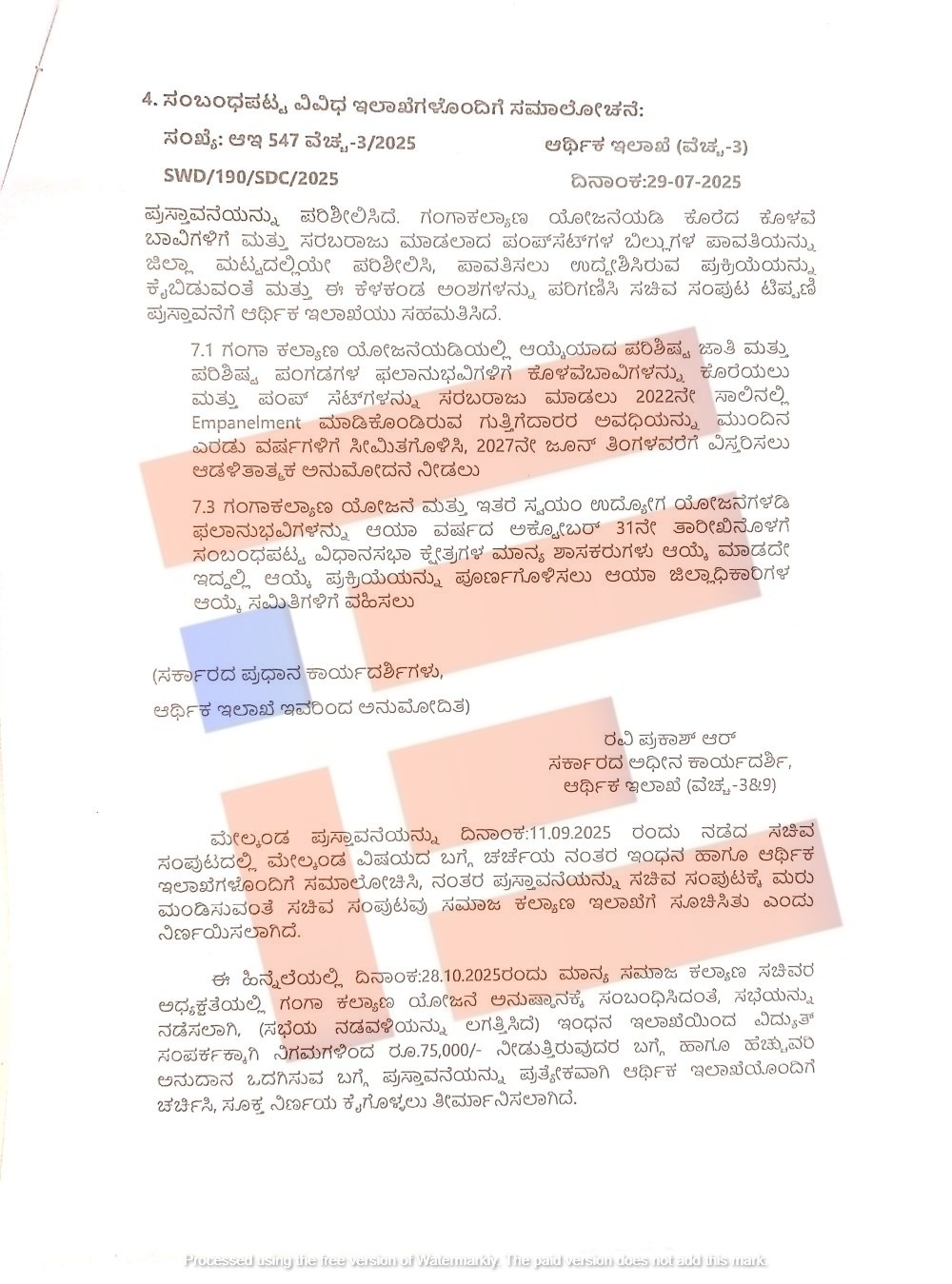 ಗಂಗಾ ಕಲ್ಯಾಣ ಯೋಜನೆಯ ಗುತ್ತಿಗೆದಾರರ ಅವಧಿಯನ್ನು ಮುಂದಿನ 2 ವರ್ಷಗಳಿಗೆ ಅಂದರೇ 2027ನೇ ಜೂನ್ ವರೆಗೆ ವಿಸ್ತರಿಸುವ ಸಂಬಂಧ ಸಮಾಜ ಕಲ್ಯಾಣ ಇಲಾಖೆಯು ಸಚಿವ ಸಂಪುಟಕ್ಕೆ ಕಡತ ಮಂಡಿಸಿತ್ತು. ಕಡತದ ಟಿಪ್ಪಣಿ ಹಾಳೆಗಳು ‘ದಿ ಫೈಲ್’ಗೆ ಲಭ್ಯವಾಗಿವೆ.