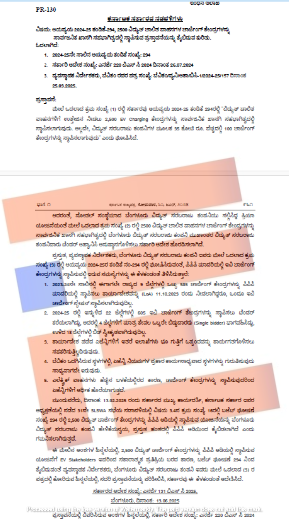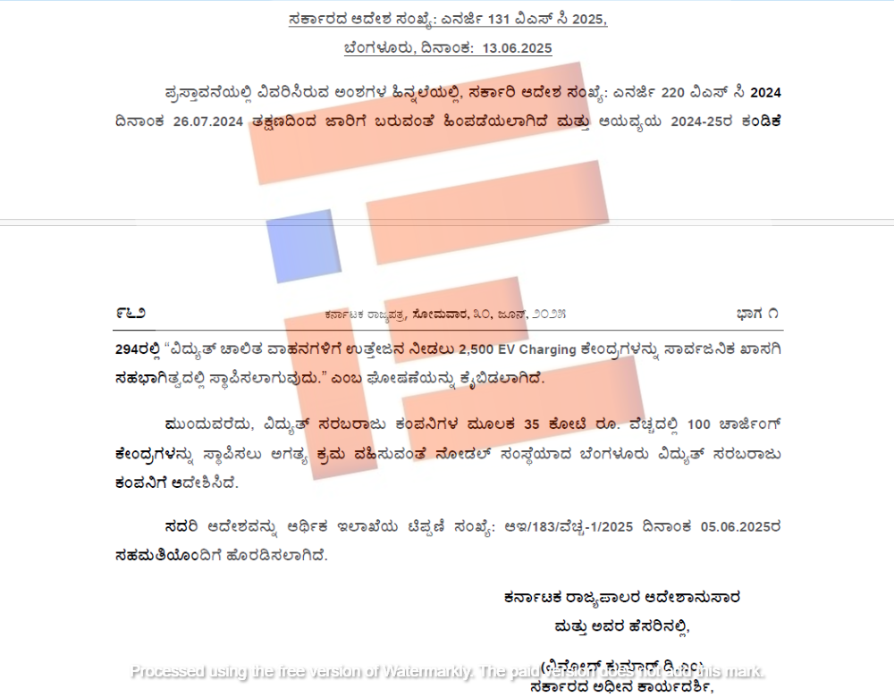 ವಿದ್ಯುತ್ ಚಾಲಿನ ವಾಹನಗಳ ಚಾರ್ಜಿಂಗ್ ಕೇಂದ್ರಗಳ ಸ್ಥಾಪನೆ ಯೋಜನೆಯನ್ನು ಕೈ ಬಿಟ್ಟಿರುವ ಸರ್ಕಾರವು ಈ ಸಂಬಂಧ 2025ರ ಜೂನ್ 13ರಂದು ಆದೇಶ ಹೊರಡಿಸಿದೆ. ಈ ಆದೇಶದ ಪ್ರತಿಯು ‘ದಿ ಫೈಲ್’ಗೆ ಲಭ್ಯವಾಗಿದೆ.