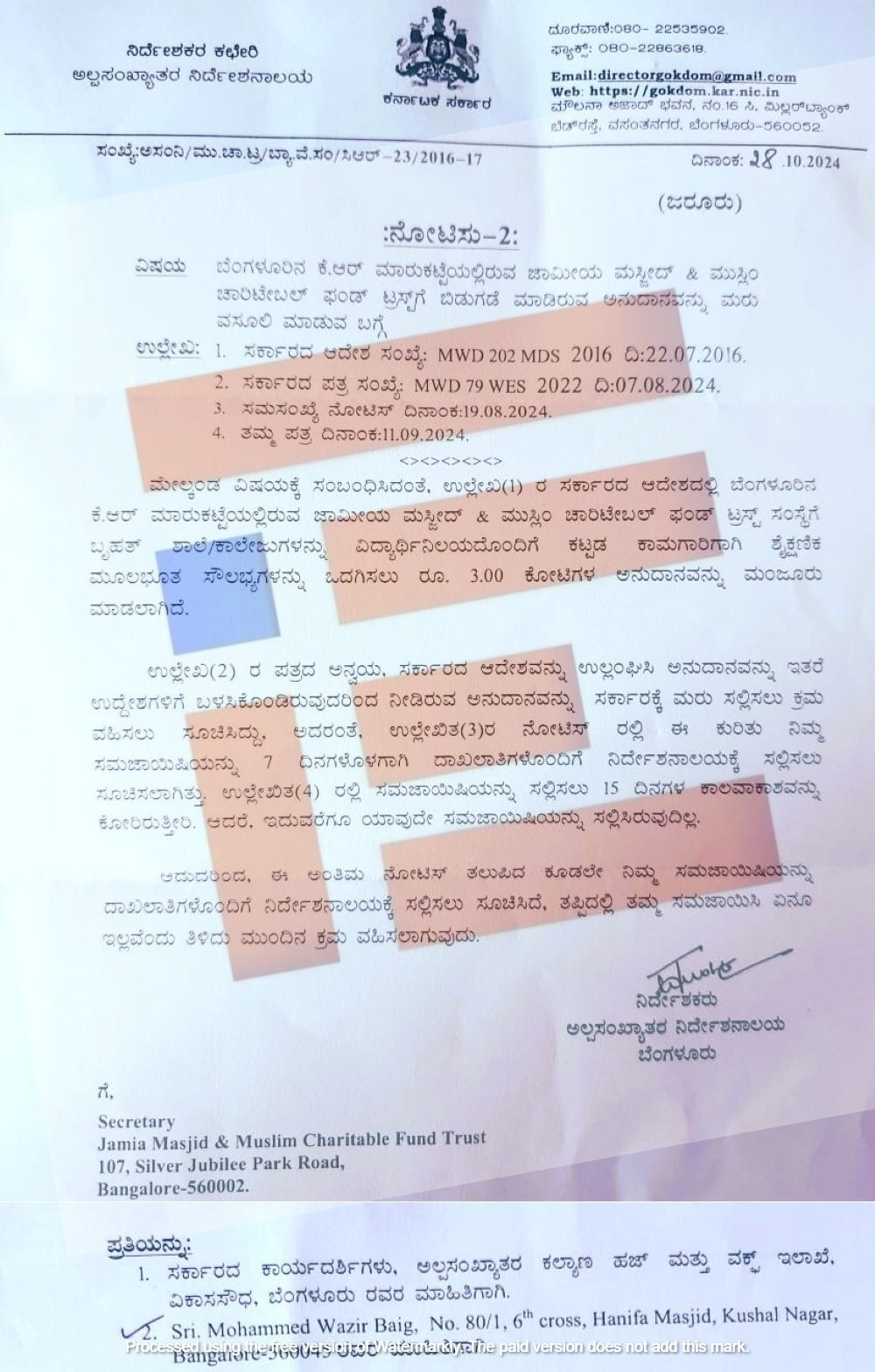 ಜಾಮೀಯಾ ಮಸ್ಜಿದ್ ಹಾಗೂ ಮುಸ್ಲಿಂ ಚಾರಿಟೇಬಲ್ ಫೌಂಡ್ ಟ್ರಸ್ಟ್ಗೆ ಬೃಹತ್ ಶಾಲೆ, ಕಾಲೇಜು, ವಿದ್ಯಾರ್ಥಿ ನಿಲಯಗಳ ಕಟ್ಟಡ ಕಾಮಗಾರಿ ಮತ್ತು ಶೈಕ್ಷಣಿಕ ಮೂಲಭೂತ ಸೌಲಭ್ಯಗಳನ್ನು ಒದಗಿಸಲು ಸರ್ಕಾರವು 3 ಕೋಟಿ ರು ಅನುದಾನ ಮಂಜೂರುಮಾಡಿತ್ತು. ಆದರೆ ಈ ಅನುದಾನವನ್ನು ಟ್ರಸ್ಟ್ ದುರುಪಯೋಗಪಡಿಸಿಕೊಂಡಿದೆ. ಈ ಹಣವನ್ನು ಮರು ವಸೂಲಿ ಮಾಡಬೇಕು. ದುರುಪಯೋಗವಾಗಿರುವ ಹಣವನ್ನು ಮರು ವಸೂಲಿ ಮಾಡುವ ಸಂಬಂಧ ನಿರ್ದೇಶನಾಲಯವು ಕೈಗೊಳ್ಳಬೇಕಾದ ಕ್ರಮಗಳ ಕುರಿತು ಸೂಕ್ತ ಶಿಫಾರಸ್ಸು, ಕಾರಣ ಮತ್ತು ಅಭಿಪ್ರಾಯವನ್ನು ಸಲ್ಲಿಸಬೇಕು ಎಂದು ಇಲಾಖೆಯ ಸರ್ಕಾರದ ಪ್ರಧಾನ ಕಾರ್ಯದರ್ಶಿಯು ಪತ್ರದಲ್ಲಿ ನಿರ್ದೇಶನ ನೀಡಿರುವುದು ಗೊತ್ತಾಗಿದೆ.