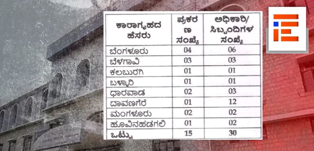ಧಾರವಾಡದಲ್ಲಿ 2 ಪ್ರಕರಣಗಳಲ್ಲಿ 3 ಮಂದಿ ಅಧಿಕಾರಿ, ಸಿಬ್ಬಂದಿ ಭಾಗಿಯಾಗಿದ್ದರೇ ದಾವಣಗೆರೆ ಕಾರಾಗೃಹದಲ್ಲಿ 01 ಪ್ರಕರಣದಲ್ಲಿ 12 ಮಂದಿ ಅಧಿಕಾರಿ, ಸಿಬ್ಬಂದಿ ಭಾಗಿಯಾಗಿದ್ದಾರೆ. ಮಂಗಳೂರಿನಲ್ಲಿ 2 ಪ್ರಕರಣಗಳಲ್ಲಿ ಇಬ್ಬರು ಅಧಿಕಾರಿ, ಸಿಬ್ಬಂದಿ, ಹೂವಿನಹಡಗಲಿ ಕಾರಾಗೃಹದಲ್ಲಿ 01 ಪ್ರಕರಣದಲ್ಲಿ ಇಬ್ಬರು ಅಧಿಕಾರಿ, ಸಿಬ್ಬಂದಿ ಭಾಗಿಯಾಗಿದ್ದಾರೆ. ಒಟ್ಟಾರೆ 15 ಪ್ರಕರಣಗಳಲ್ಲಿ 30 ಮಂದಿ ಅಧಿಕಾರಿ, ಸಿಬ್ಬಂದಿ ಭಾಗಿಯಾಗಿದ್ದಾರೆ.