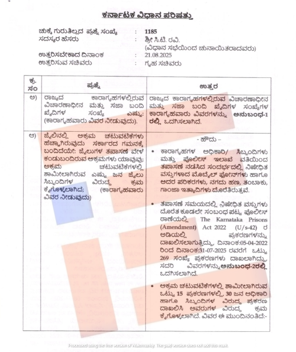 ಜೈಲುಗಳ ಅಧಿಕಾರಿಗಳು ಮತ್ತು ಸಿಬ್ಬಂದಿಗಳು ಅಕ್ರಮ ಚಟುವಟಿಕೆಗಳಲ್ಲಿ ಭಾಗಿಯಾಗಿರುವುದನ್ನು ಸ್ವತಹ ಗೃಹ ಸಚಿವ ಡಾ ಜಿ ಪರಮೇಶ್ವರ್ ಅವರು ವಿಧಾನ ಪರಿಷತ್ ಸದಸ್ಯ ಸಿ ಟಿ ರವಿ ಅವರು ಕೇಳಿದ್ದ ಚುಕ್ಕೆ ಗುರುತಿಲ್ಲದ ಪ್ರಶ್ನೆಗೆ 2025ರ ಆಗಸ್ಟ್ನಲ್ಲೇ ಉತ್ತರ ನೀಡಿದ್ದರು.