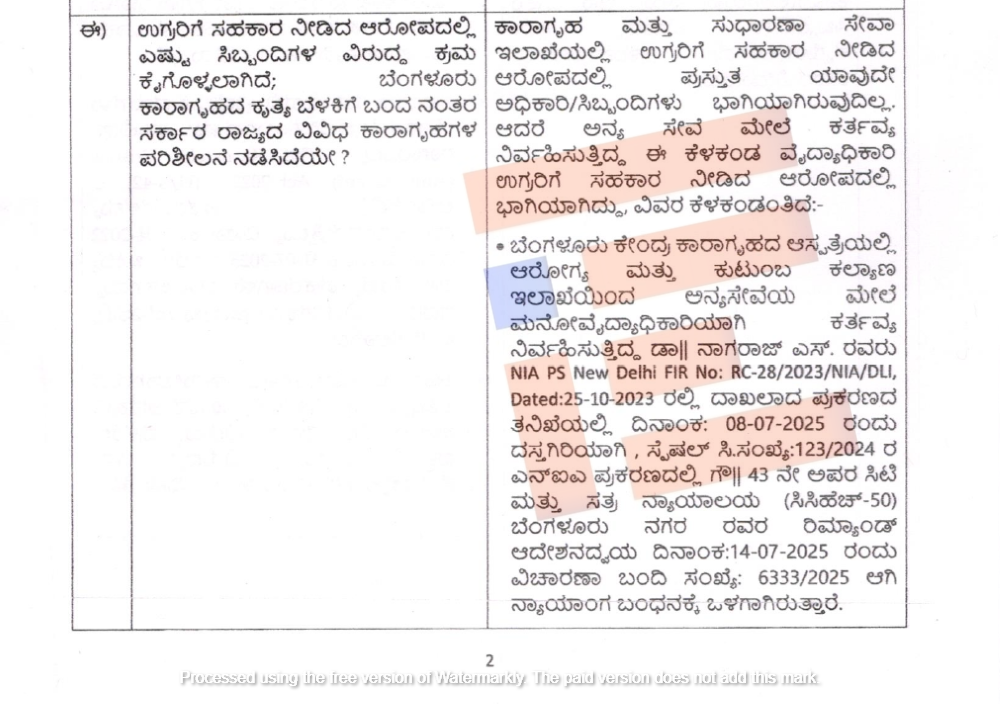 ಕಾರಾಗೃಹ ಮತ್ತು ಸುಧಾರಣೆ ಸೇವಾ ಇಲಾಖೆಯಲ್ಲಿ ಉಗ್ರರಿಗೆ ಸಹಕಾರ ನೀಡಿದ ಆರೋಪದಲ್ಲಿ ಪ್ರಸ್ತುತ ಯಾವುದೇ ಅಧಿಕಾರಿ, ಸಿಬ್ಬಂದಿಗಳು ಭಾಗಿಯಾಗಿರುವುದಿಲ್ಲ. ಆದರೆ ಅನ್ಯ ಸೇವೆ ಮೇಲೆ ಕರ್ತವ್ಯ ನಿರ್ವಹಿಸುತ್ತಿದ್ದ ವೈದ್ಯಾಧಿಕಾರಿ, ಉಗ್ರರಿಗೆ ಸಹಕಾರ ನೀಡಿದ ಆರೋಪದಲ್ಲಿ ಭಾಗಿಯಾಗಿರುವುದನ್ನು ಸರ್ಕಾರವು ಒಪ್ಪಿಕೊಂಡಿತ್ತು.