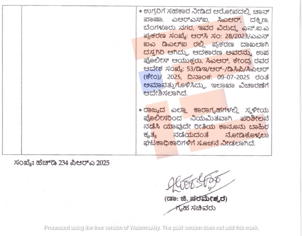 ಉಗ್ರರಿಗೆ ಸಹಕಾರ ನೀಡಿದ ಆರೋಪದಲ್ಲಿ ಬೆಂಗಳೂರು ನಗರ ದಕ್ಷಿಣ ವಿಭಾಗದ ಎಆರ್ಎಸ್ಐ ಚಾಂದ್ ಪಾಷಾ ಅವರ ವಿರುದ್ಧ ಆರ್ ಸಿ ಸಂಖ್ಯೆ 28/2023 ಎಎನ್ಡಿಎ ಡಿಎಲ್ಐ ರಲ್ಲಿ ಪ್ರಕರಣ ದಾಖಲಾಗಿ ದಸ್ತಗಿರಿ ಆಗಿದ್ದಾರೆ. ಆದ ಕಾರಣ ಅವರನ್ನು 2025ರ ಜುಲೈ 9ರಂದು ಅಮಾನತುಗೊಳಿಸಿ ಇಲಾಖೆ ವಿಚಾರಣೆಗೆ ಆದೇಶಿಸಿದೆ.