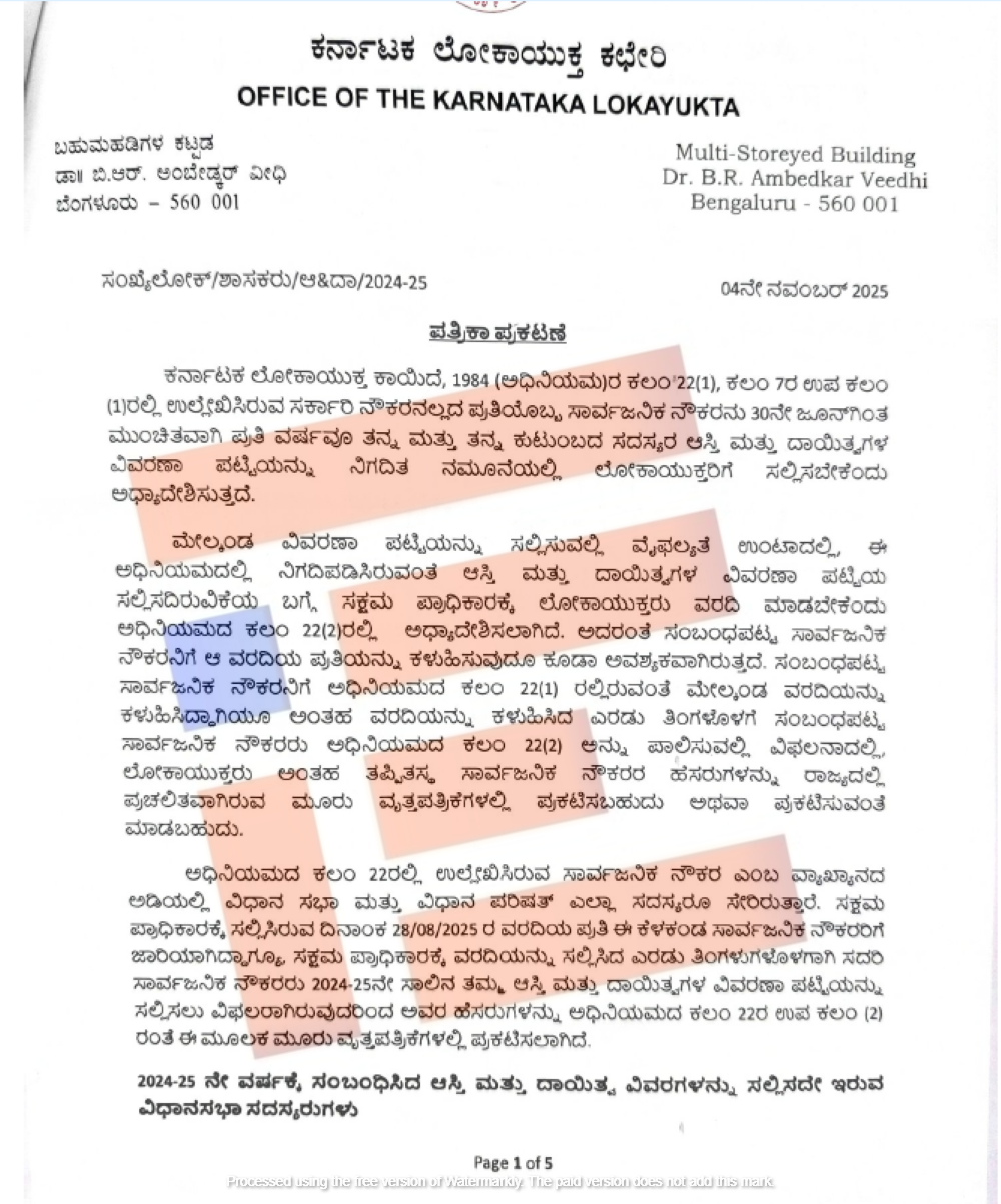 ಸಾರ್ವಜನಿಕ ನೌಕರ ಎಂಬ ವ್ಯಾಖ್ಯಾನದ ಅಡಿಯಲ್ಲಿ ವಿದಾನಸಭಾ ಮತ್ತು ವಿಧಾನ ಪರಿಷತ್ ಎಲ್ಲಾ ಸದಸ್ಯರೂ ಸೇರಿರುತ್ತಾರೆ. ಸಕ್ಷಮ ಪ್ರಾಧಿಕಾರಕ್ಕೆ ಸಲ್ಲಿಸಿರುವ 2025ರ ಆಗಸ್ಟ್ 28ರಂದೇ ವರದಿಯನ್ನು ಸಚಿವರು, ಶಾಸಕರಿಗೆ ಜಾರಿಯಾಗಿತ್ತು. ಆಧರೂ ಸಹ ಆಸ್ತಿ ಮತ್ತು ದಾಯಿತ್ವದ ವಿವರಣಾ ಪಟ್ಟಿಯನ್ನು ಸಲ್ಲಿಸುವಲ್ಲಿ ವಿಫಲರಾಗಿರುವುದು ಪಟ್ಟಿಯಿಂದ ತಿಳಿದು ಬಂದಿದೆ.