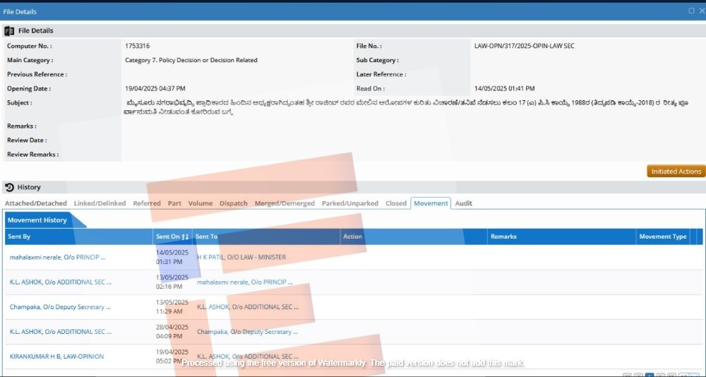 ಕಾನೂನು ಇಲಾಖೆಯು ಒದಗಿಸಿದ್ದ ಕಡತದ ಸಂಖ್ಯೆಯನ್ನು ‘ದಿ ಫೈಲ್’, ಇ-ಆಫೀಸ್ ತಂತ್ರಾಂಶದಲ್ಲಿಯೂ ಪರಿಶೀಲಿಸಿತ್ತು. ಈ ಕಡತವು 2025ರ ಮೇ 14ರಿಂದಲೂ ಸಚಿವ ಹೆಚ್ ಕೆ ಪಾಟೀಲ್ ಅವರ ಲಾಗಿನ್ನಲ್ಲಿಯೇ ಇರುವುದು ಗೊತ್ತಾಗಿದೆ.