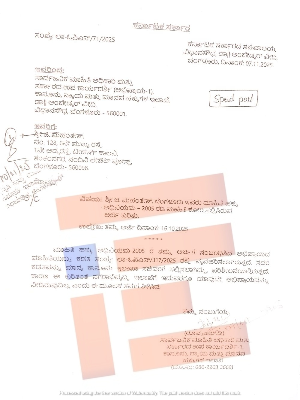 ‘ಕಡತ ಸಂಖ್ಯೆ ಲಾ-ಓಪಿಎನ್/317/2025ರಲ್ಲಿ ವ್ಯವಹರಿಸಲಾಗಿದೆ. ಈ ಕಡತವನ್ನು ಕಾನೂನು ಇಲಾಖೆ ಸಚಿವರಿಗೆ ಸಲ್ಲಿಸಲಾಗಿದ್ದು ಪರಿಶೀಲನೆಯಲ್ಲಿರುತ್ತದೆ. ಕಾರಣ ಈ ಕುರಿತಂತೆ ನಗರಾಭಿವೃದ್ಧಿ ಇಲಾಖೆಗೆ ಇದುವರೆಗೂ ಯಾವುದೇ ಅಭಿಪ್ರಾಯವನ್ನೂ ನೀಡಿರುವುದಿಲ್ಲ,’ ಎಂದು ಕಾನೂನು, ನ್ಯಾಯ ಮತ್ತು ಮಾನವ ಹಕ್ಕುಗಳ ಇಲಾಖೆಯು ಆರ್ಟಿಐ ಅಡಿಯಲ್ಲಿ ಮಾಹಿತಿ ಒದಗಿಸಿದೆ.