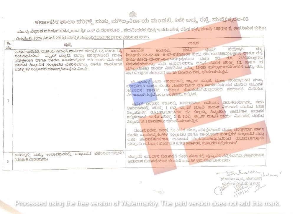 ‘ಹೀಗಾಗಿ ಸದರಿ ಪರೀಕ್ಷೆಗಳಲ್ಲಿ ಜಾಗೃತ ದಳ, ಮುಖ್ಯ ಪರೀಕ್ಷಕ, ಜಂಟಿ ಮುಖ್ಯ ಪರೀಕ್ಷಕ, ಕೊಠಡಿ ಸೂಪರ್‍‌ವೈಸರ್‍‌ಗಳಾಗಿ ಕಾರ್ಯನಿರ್ವಹಿಸಿದ ಸಿಬ್ಬಂದಿಗೆ ಸಂಭಾವನೆ ಪಾವತಿಗೆ ಅನುದಾನ ಕೊರತೆಯಾಗಿದೆ. ಹೀಗಾಗಿ ಸಂಭಾವನೆ ವಿತರಿಸಲು ವಿಳಂಬವಾಗಿದೆ,’ ಎಂದು ಮಂಡಳಿ ನಿರ್ದೇಶಕರು ಸರ್ಕಾರಕ್ಕೆ ಮಾಹಿತಿ ಒದಗಿಸಿರುವುದು ತಿಳಿದು ಬಂದಿದೆ.