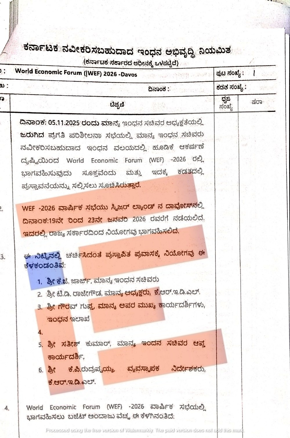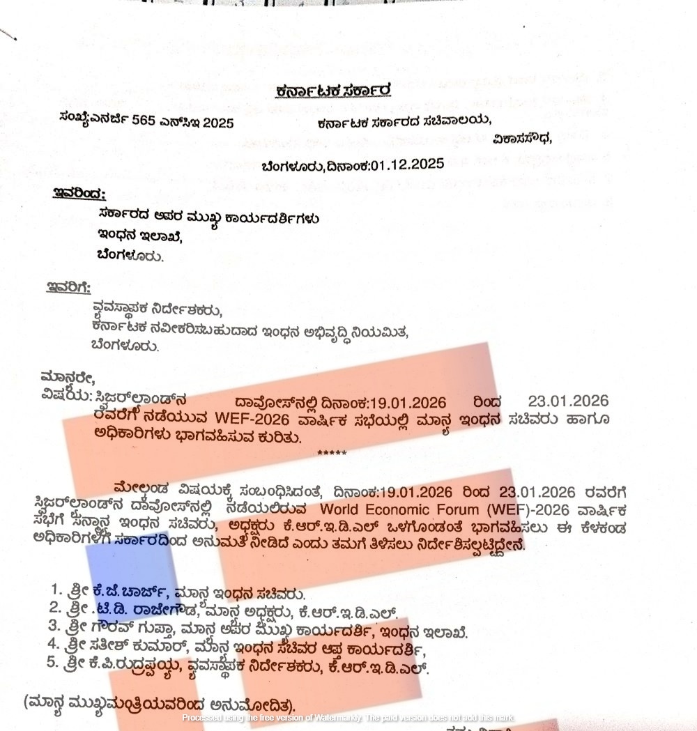 ಬೆಂಗಳೂರು; ದಾವೋಸ್ನಲ್ಲಿ 2026ರಲ್ಲಿ ನಡೆಯಲಿರುವ ವಿಶ್ವ ಆರ್ಥಿಕ ವೇದಿಕೆಯಲ್ಲಿ ಇಂಧನ ವಲಯದಲ್ಲಿ ಹೂಡಿಕೆಗೆ ಆಕರ್ಷಿಸಲು ಸಚಿವ ಕೆ ಜೆ ಜಾರ್ಜ್ ಅಧ್ಯಕ್ಷತೆಯಲ್ಲಿ ರಾಜ್ಯ ಸರ್ಕಾರದ ನಿಯೋಗ ತೆರಳಲು ಸರ್ಕಾರವು ಅನುಮತಿ ನೀಡಿದೆ.