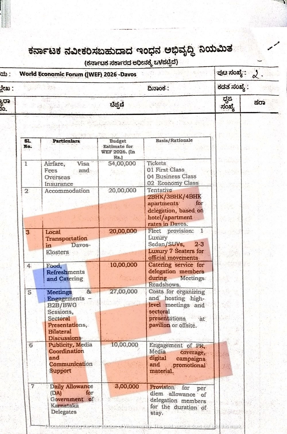 ಸ್ವಿಟ್ಜರ್ಲೆಂಡ್ನ ದಾವೋಸ್ನಲ್ಲಿ 2024ರ ಜನವರಿಯಲ್ಲಿ ನಡೆಯಲಿರುವ ವಿಶ್ವ ಆರ್ಥಿಕ ವೇದಿಕೆಯ ಸಮಾವೇಶದಲ್ಲಿ ಭಾಗವಹಿಸಿದ್ದ ಮುಖ್ಯಮಂತ್ರಿ ಸಿದ್ದರಾಮಯ್ಯ ನೇತೃತ್ವದ ನಿಯೋಗಕ್ಕೆ 12 ಕೋಟಿ ವೆಚ್ಚವಾಗಲಿದೆ ಎಂದು ಹೇಳಲಾಗಿತ್ತು.