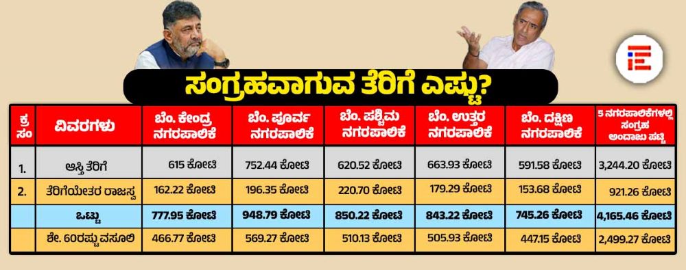 ಒಟ್ಟಾರೆಯಾಗಿ ಈ ಐದೂ ನಗರಪಾಲಿಕೆಗಳಿಗೆ ಆಸ್ತಿ ತೆರಿಗೆ ರೂಪದಲ್ಲಿ 3,244.20 ಕೋಟಿ ರು ಮತ್ತು ತೆರಿಗೆಯೇತರ ಆದಾಯದಲ್ಲಿ 921.26 ಕೋಟಿ ರು ಸೇರಿ 4,165. 46 ಕೋಟಿ ರು ಸಂಗ್ರಹವಾಗಲಿದೆ ಎಂದು ಅಂದಾಜಿಸಿದೆ. ಇದರಲ್ಲಿಯೂ ಶೇ.60ರಷ್ಟು ವಸೂಲಾದಲ್ಲಿ 2,499.27 ಕೋಟಿ ಸಂಗ್ರಹವಾಗಬಹುದು ಎಂದು ಲೆಕ್ಕ ಹಾಕಿದೆ.