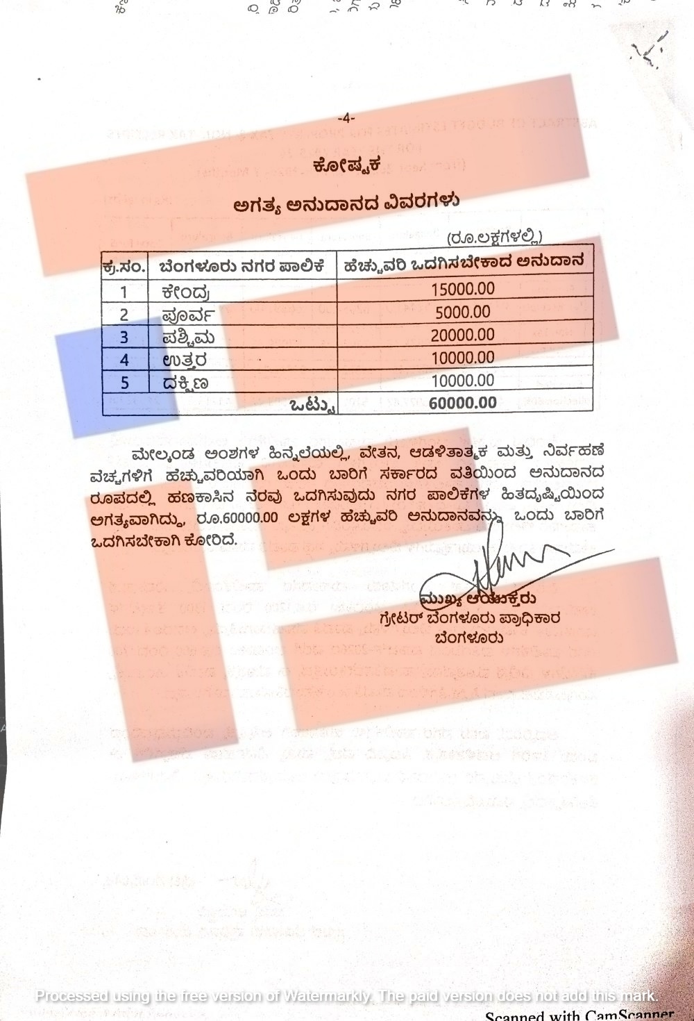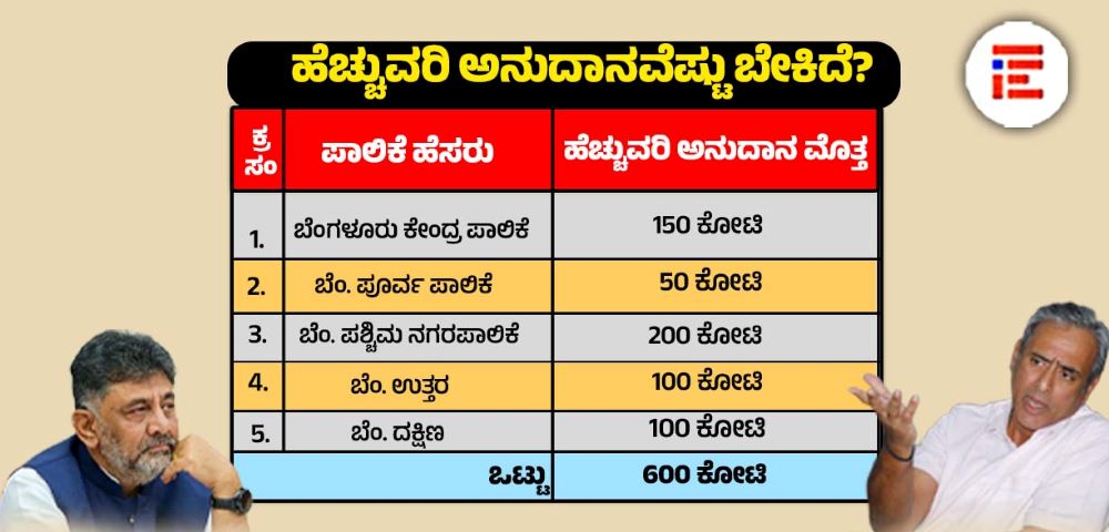ಬೆಂಗಳೂರು ಕೇಂದ್ರ ಪಾಲಿಕೆಗೆ 150 ಕೋಟಿ, ಪೂರ್ವ ಪಾಲಿಕೆಗೆ 50 ಕೋಟಿ, ಪಶ್ಚಿಮ ನಗರಪಾಲಿಕೆಗೆ 200 ಕೋಟಿ ರು., ಉತ್ತರಕ್ಕೆ 100 ಕೋಟಿ, ದಕ್ಷಿಣಕ್ಕೆ 100 ಕೋಟಿ ರು ಸೇರಿ ಒಟ್ಟಾರೆ 600 ಕೋಟಿ ರು ಅನುದಾನವನ್ನು ಒದಗಿಸಬೇಕು ಎಂದು ಕೋರಿರುವುದು ಪತ್ರದಿಂದ ತಿಳಿದು ಬಂದಿದೆ.
