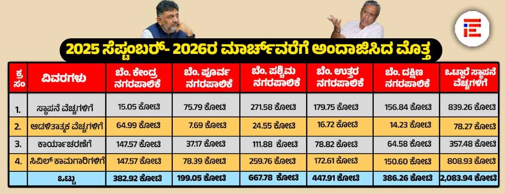 ಅದೇ ರೀತಿ ಬೆಂಗಳೂರು ಉತ್ತರ ನಗರಪಾಲಿಕೆಗೆ ಸ್ಥಾಪನೆ ವೆಚ್ಚಗಳಿಗಾಗಿ 179.75 ಕೋಟಿ , ಆಡಳಿತಾತ್ಮಕ ವೆಚ್ಚಗಳಿಗಾಗಿ 16.72 ಕೋಟಿ, ಕಾರ್ಯಾಚರಣೆಗೆ 78.82 ಕೋಟಿ, ಸಿವಿಲ್ ಕಾಮಗಾರಿಗಳಿಗೆ 172.61 ಕೋಟಿ ಸೇರಿ 447.91ಕೋಟಿ ರು ವೆಚ್ಚವಾಗಲಿದೆ ಎಂದು ಅಂದಾಜಿಸಿದೆ.