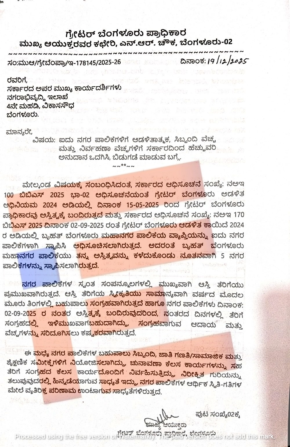 ‘ನಗರ ಪಾಲಿಕೆಗಳ ಸ್ವಂತ ಸಂಪನ್ಮೂಲಗಳಲ್ಲಿ ಮುಖ್ಯವಾಗಿ ಆಸ್ತಿ ತೆರಿಗೆಯು ಪ್ರಮುಖವಾಗಿದೆ. ಆಸ್ತಿ ತೆರಿಗೆಯ ಸ್ವೀಕೃತಿಯು ಸಾಮಾನ್ಯವಾಗಿ ವರ್ಷದ ಮೊದಲ ಮೂರು ತಿಂಗಳಲ್ಲಿ ಬಹುಪಾಲು ಸಂಗ್ರಹವಾಗಿರುತ್ತದೆ. ಹಾಗೂ ನಗರಪಾಲಿಕೆಗಳು 2025ರ ಸೆ.2ರಂದು ಅಸ್ತಿತ್ವಕ್ಕೆ ಬಂದಿರುವುದರಿಂದ ನಂತರದ ದಿನಗಳಲ್ಲಿ ತೆರಿಗೆ ಸಂಗ್ರಹದಲ್ಲಿ ಇಳಿಮುಖವಾಗಬಹುದಾಗಿದ್ದು, ಸಂಗ್ರಹವಾಗುವ ಆದಾಯ ಮತ್ತು ವೆಚ್ಚಗಳನ್ನು ಸರಿದೂಗಿಸಲು ಕಷ್ಟಕರವಾಗಿರುತ್ತದೆ,’ ಎಂದು ಗ್ರೇಟರ್ ಬೆಂಗಳೂರು ಪ್ರಾಧಿಕಾರದ ಮುಖ್ಯ ಆಯುಕ್ತರು ಆತಂಕ ವ್ಯಕ್ತಪಡಿಸಿರುವುದು ಪತ್ರದಿಂದ ಗೊತ್ತಾಗಿದೆ.