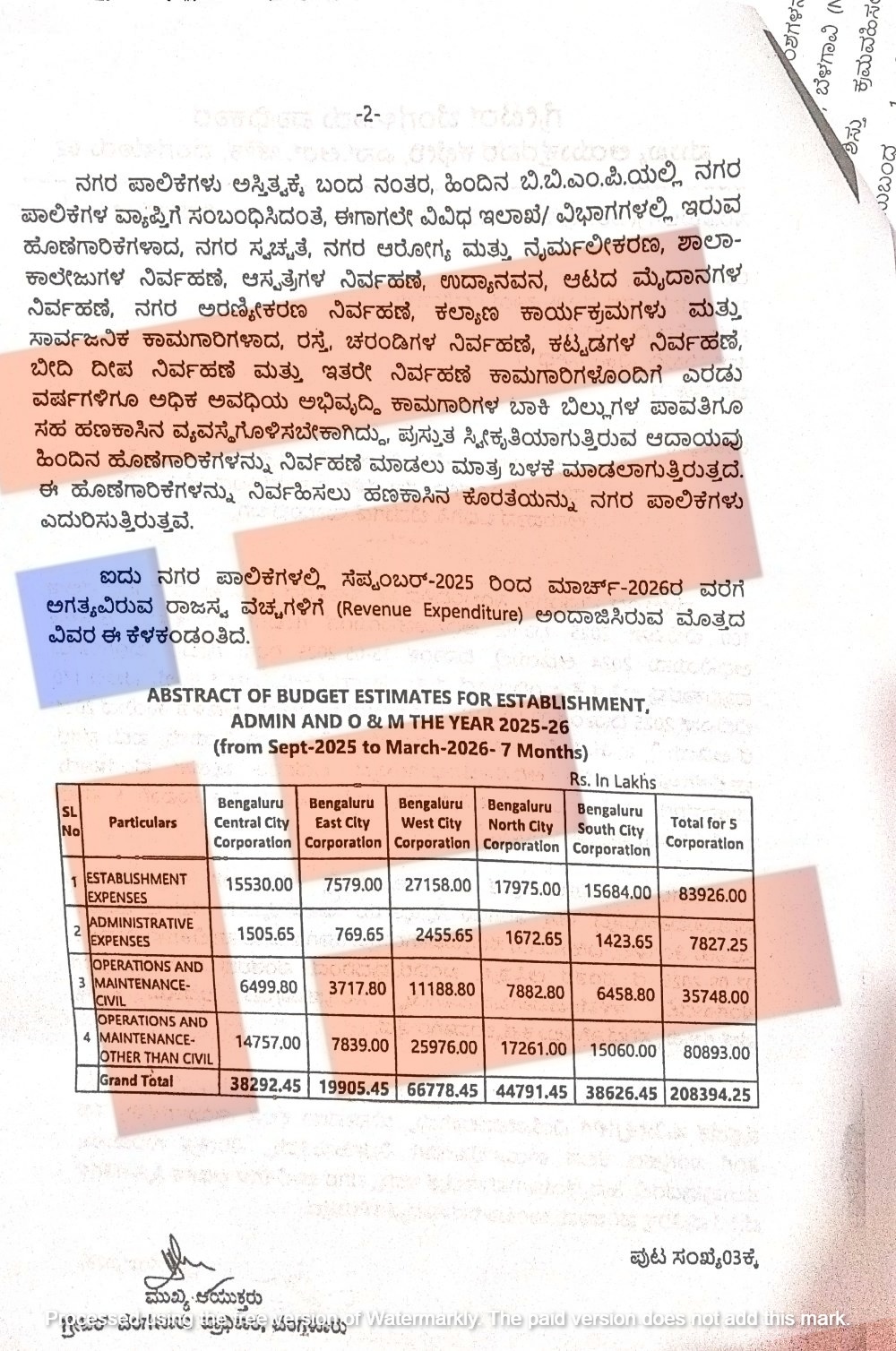ಬೆಂಗಳೂರು ಕೇಂದ್ರ ನಗರಪಾಲಿಕೆಗೆ ಸ್ಥಾಪನೆ ವೆಚ್ಚಗಳಿಗಾಗಿ 155.30 ಕೋಟಿ , ಆಡಳಿತಾತ್ಮಕ ವೆಚ್ಚಗಳಿಗಾಗಿ 15. 05 ಕೋಟಿ, ಕಾರ್ಯಾಚರಣೆಗೆ 64.99 ಕೋಟಿ, ಸಿವಿಲ್ ಕಾಮಗಾರಿಗಳಿಗೆ 147.57ಕೋಟಿ ಸೇರಿ 382.92 ಕೋಟಿ ರು ಅಂದಾಜಿಸಿದೆ.