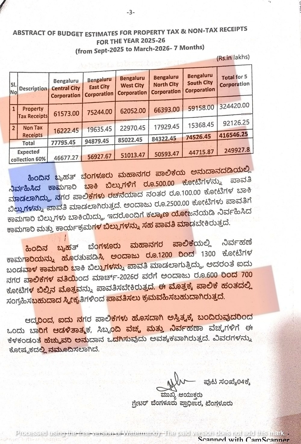 ಬೆಂಗಳೂರು ಕೇಂದ್ರ ನಗರಪಾಲಿಕೆಗೆ ಆಸ್ತಿ ತೆರಿಗೆ ರೂಪದಲ್ಲಿ 615 ಕೋಟಿ, ತೆರಿಗೆಯೇತರ ರಾಜಸ್ವದ ರೂಪದಲ್ಲಿ 162.22 ಕೋಟಿ ರು 777.95 ಕೋಟಿ ರು ಜಮೆಯಾಗಬಹುದು ಎಂದು ಅಂದಾಜಿಸಿದೆ. ಇದರಲ್ಲಿ ಶೇ. 60ರಷ್ಟು ವಸೂಲಿ ಆದರೆ 466.77 ಕೋಟಿ ರು ಜಮೆಯಾಗಬಹುದು ಎಂದಿದೆ.