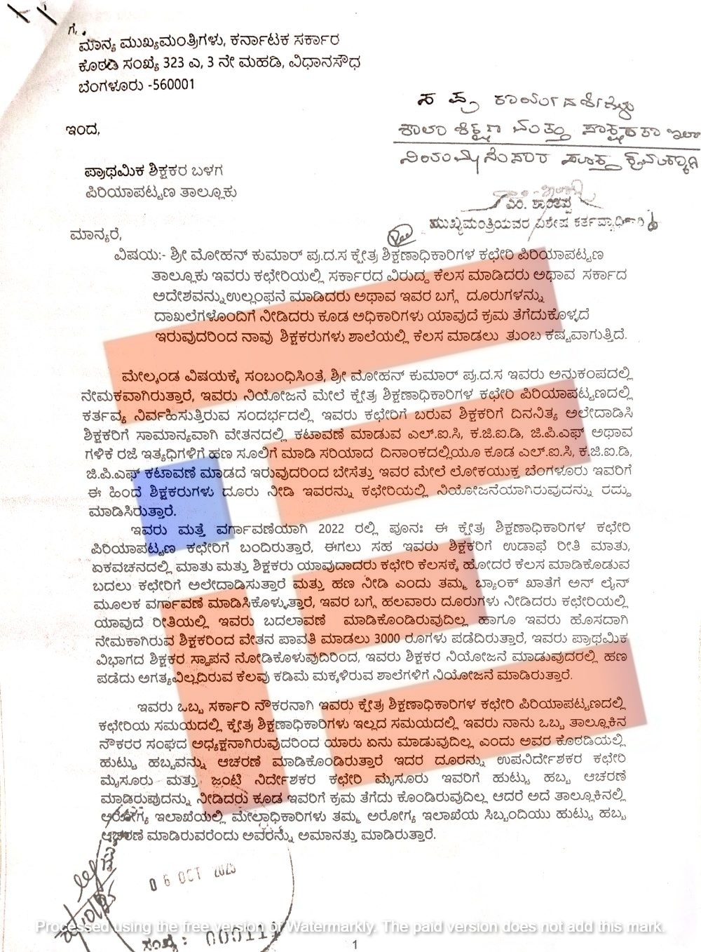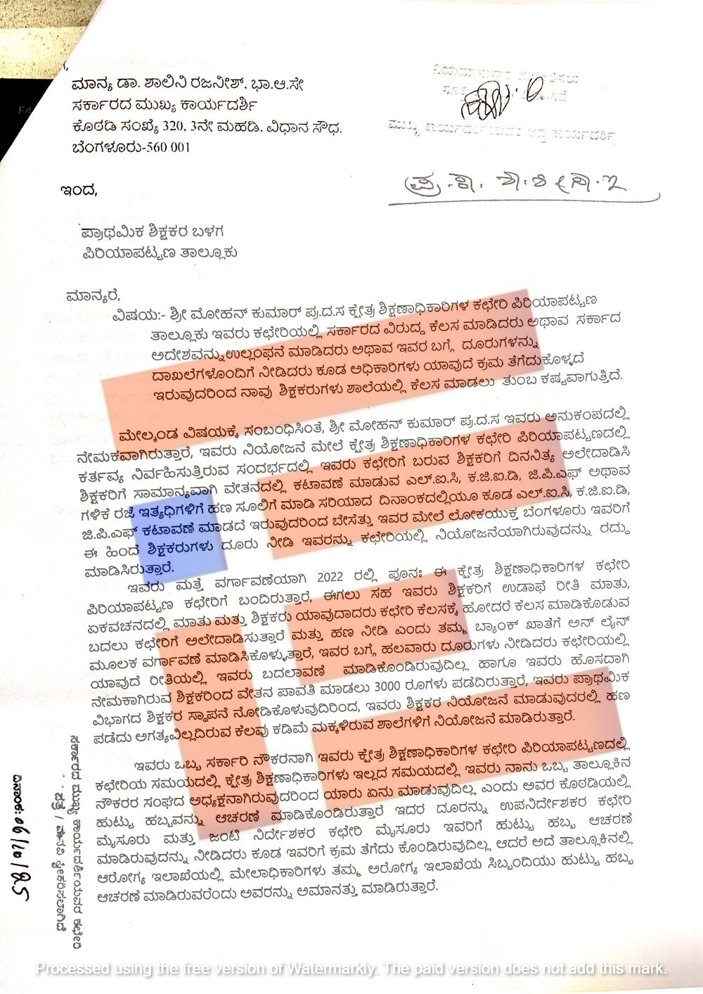 ಈ ದೂರನ್ನು ಸ್ವೀಕರಿಸಿರುವ ಮುಖ್ಯಮಂತ್ರಿಗಳ ಸಚಿವಾಲಯ ಮತ್ತು ಮುಖ್ಯ ಕಾರ್ಯದರ್ಶಿಗಳ ಕಚೇರಿಯೂ ಯಥಾ ಪ್ರಕಾರ ‘ನಿಯಮಾನುಸಾರ ಸೂಕ್ತ ಕ್ರಮಕ್ಕಾಗಿ,’ ಎಂದು ಷರಾ ಬರೆದು, ಶಾಲಾ ಶಿಕ್ಷಣ ಮತ್ತು ಸಾಕ್ಷರತೆ ಇಲಾಖೆಯ ಸರ್ಕಾರದ ಪ್ರಧಾನ ಕಾರ್ಯದರ್ಶಿಗೆ ರವಾನೆ ಮಾಡಿ ಕೈತೊಳೆದುಕೊಂಡಿದೆ.